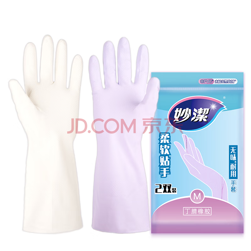 妙洁 无味耐用橡胶手套丁腈橡胶 2双装中号 厨房洗碗家务清洁洗衣