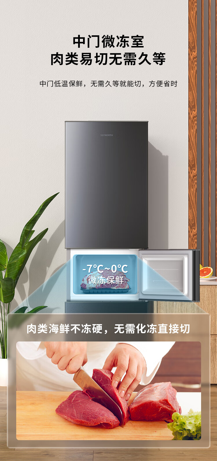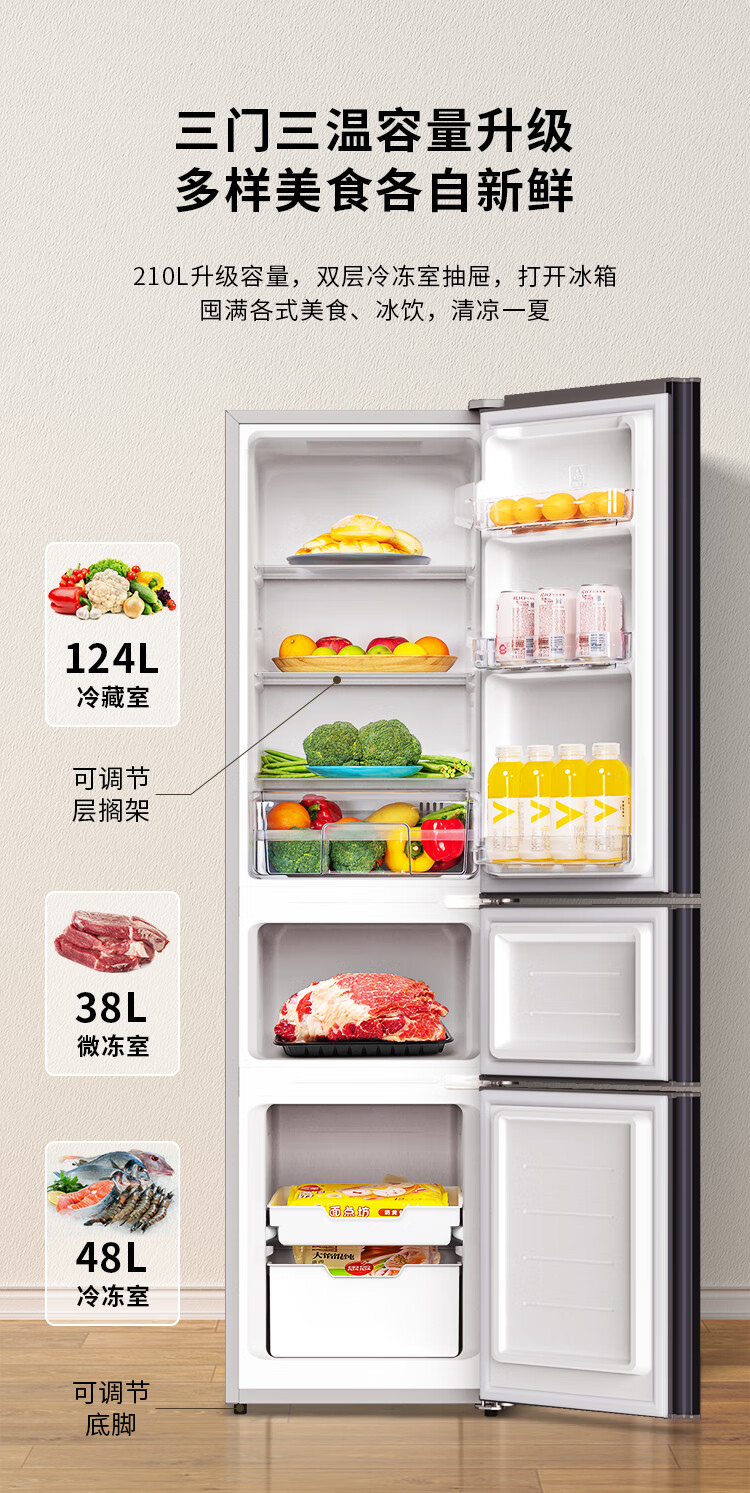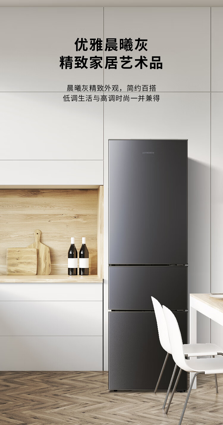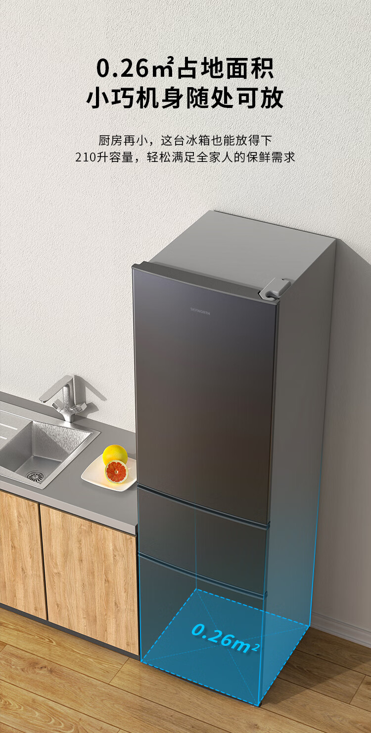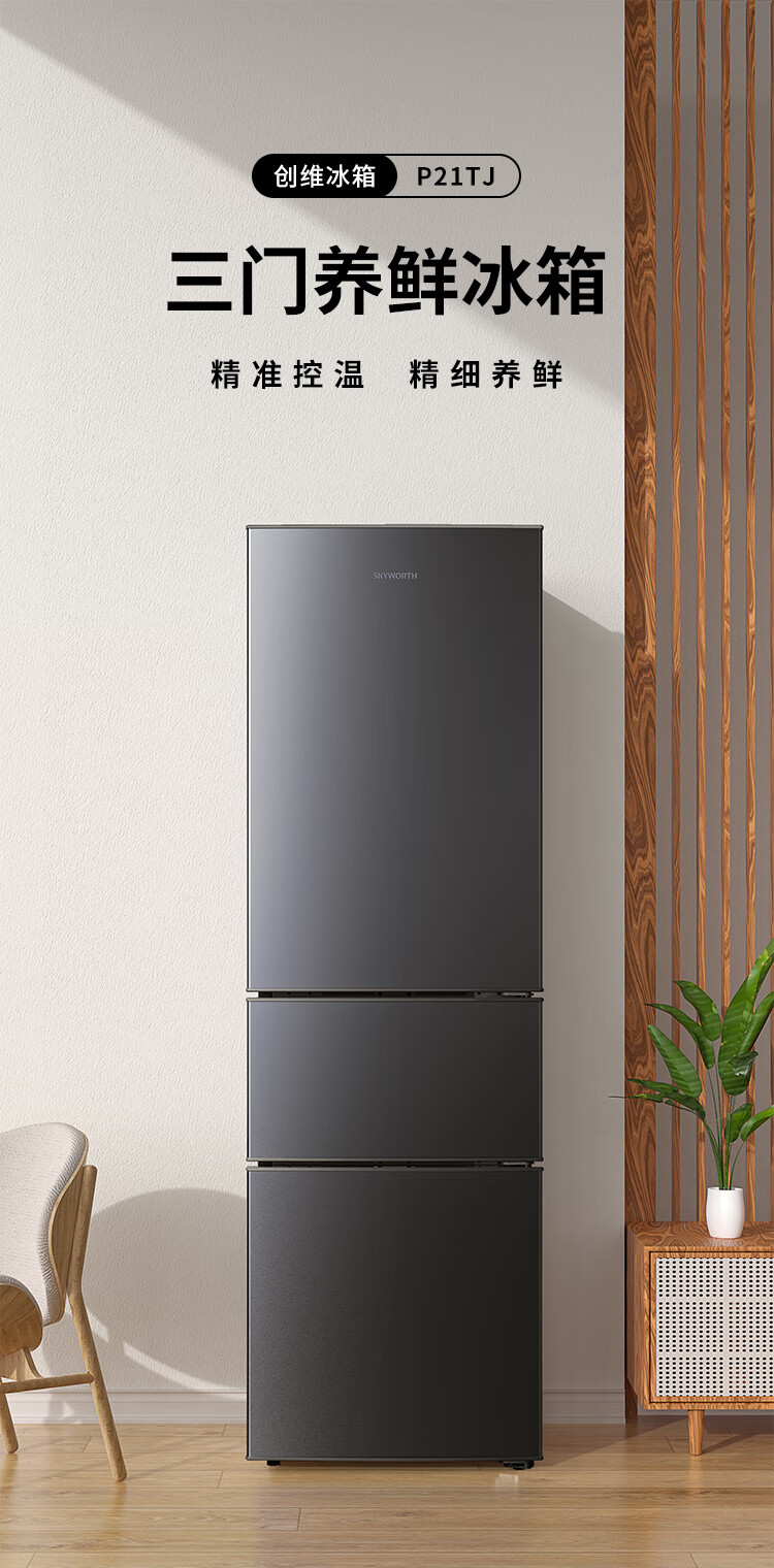 创维 (SKYWORTH)210升小冰箱 三门家用小型电冰箱 三门三温区中门软冷冻 保鲜省电低音P21TJ