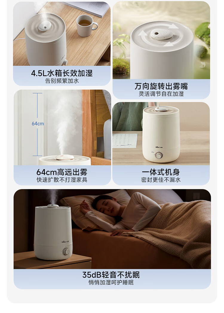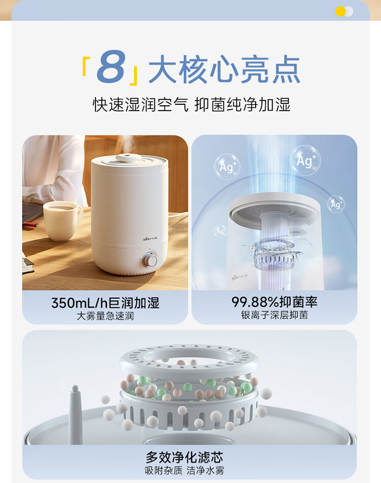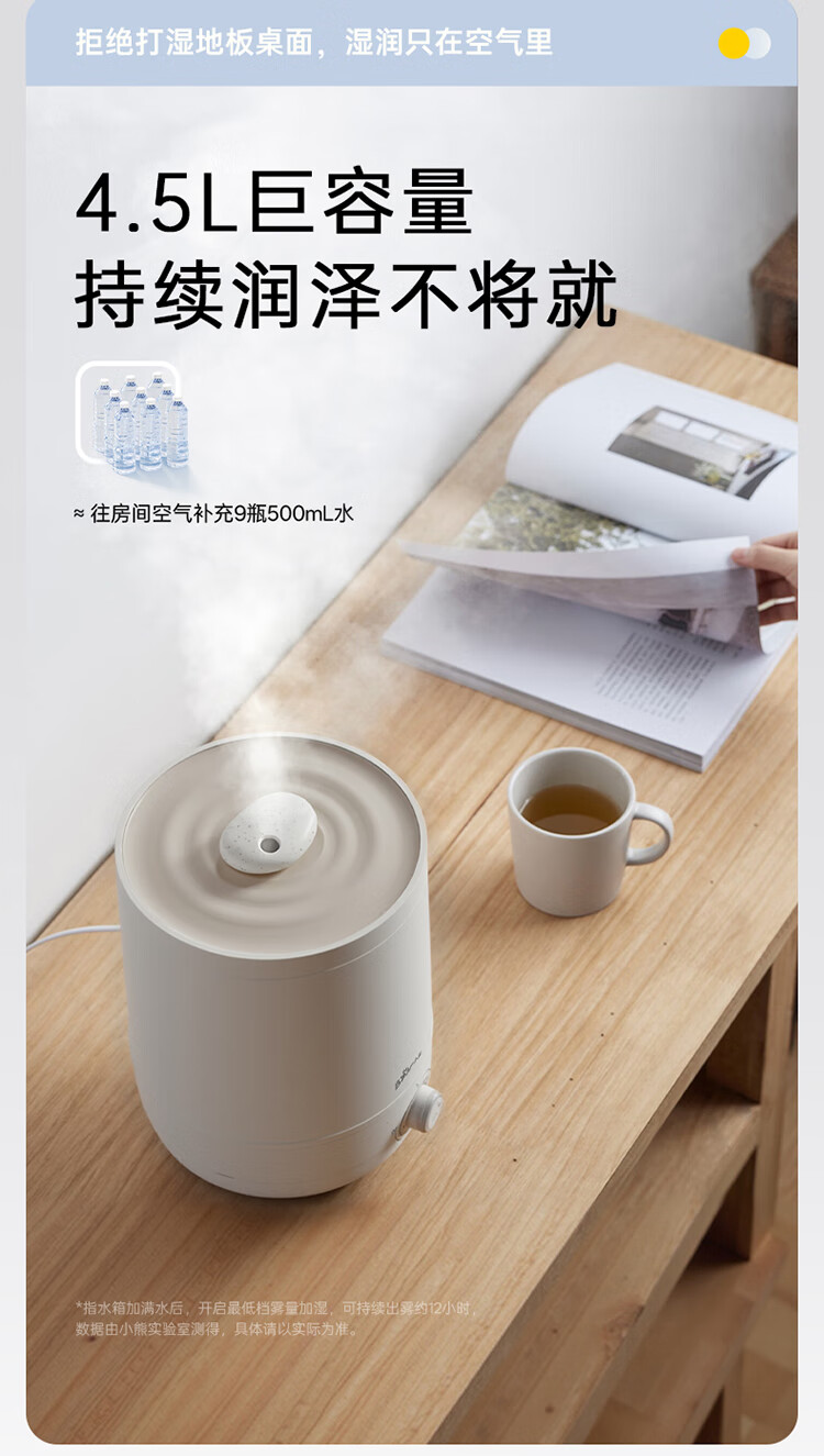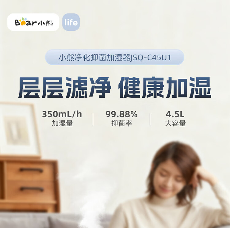 小熊(Bear)加湿器家用卧室 桌面大雾量办公室空调房轻音 母婴幼儿空气净化抑菌加湿器小型 JSQ-C45U1