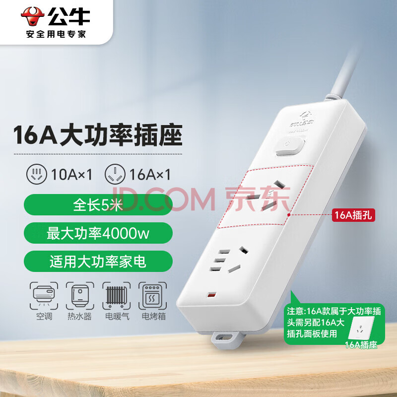 公牛(BULL)大功率16A插座/插线板/插排/接线板 适用空调/热水器/电暖气 2位总控全长5米送10A头 GN-S102D
