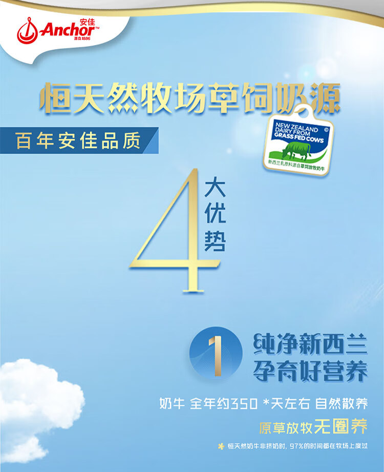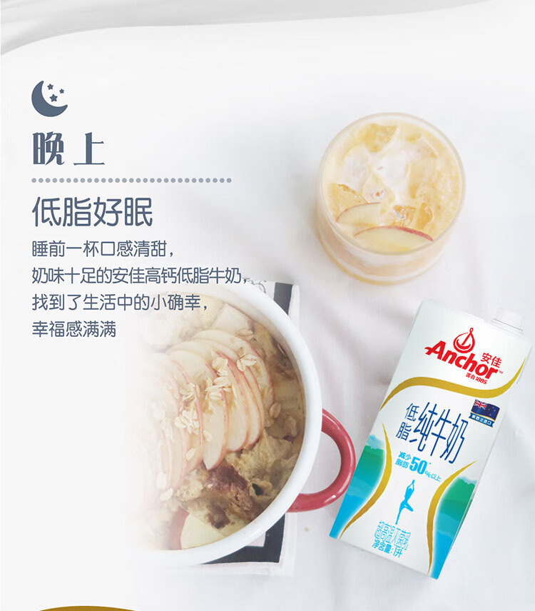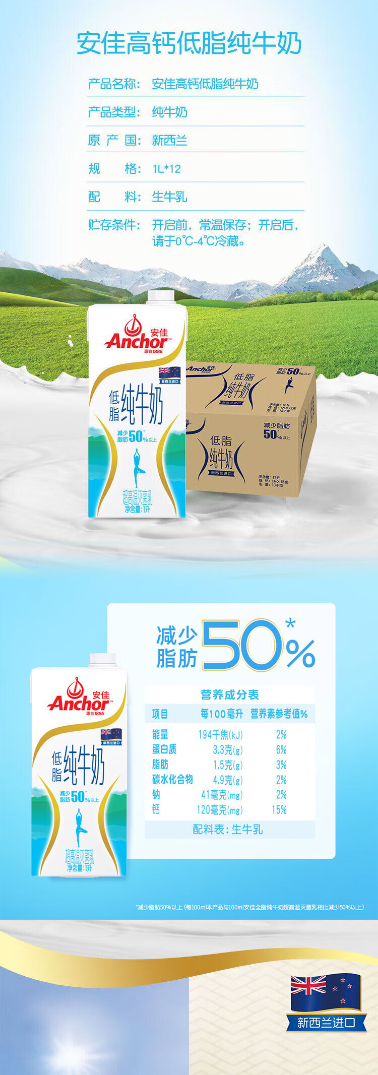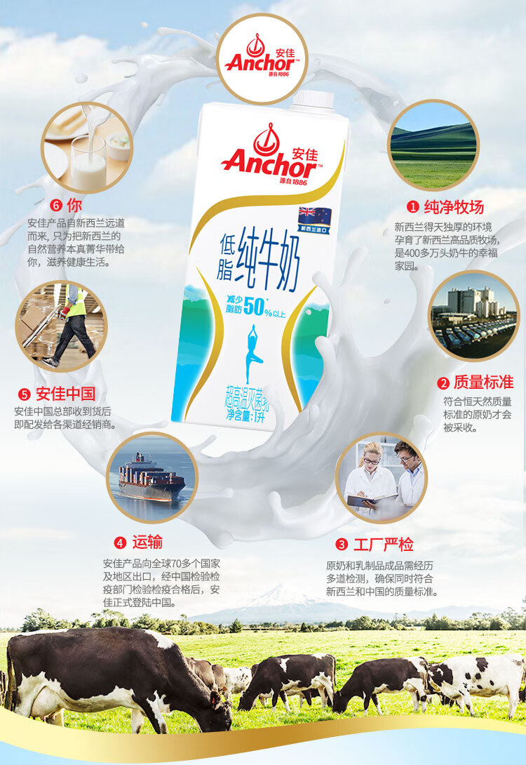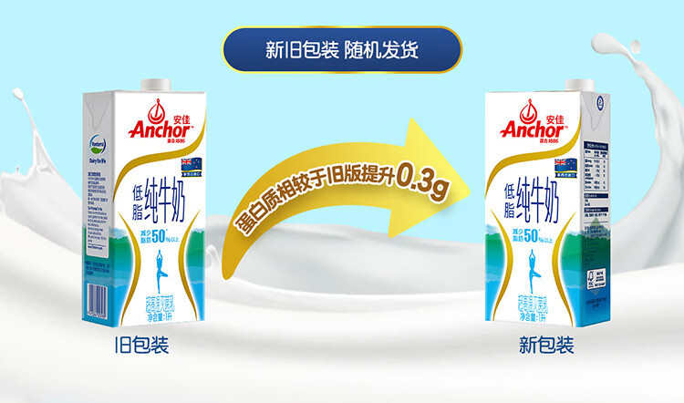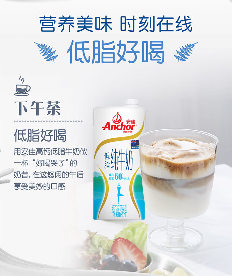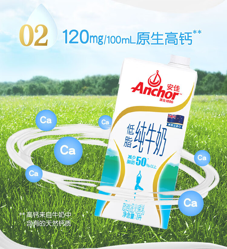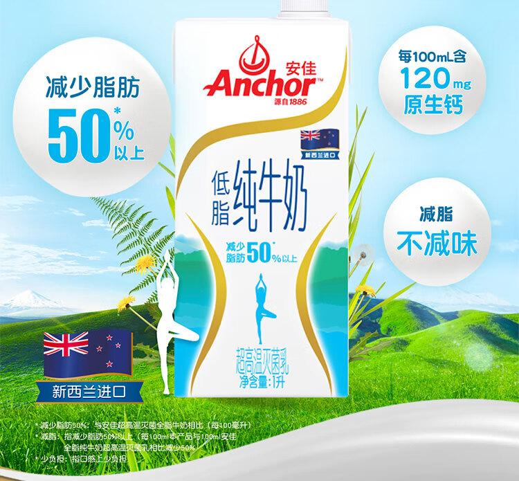 安佳(Anchor)低脂牛奶高钙纯牛奶新西兰原装进口草饲1L*12盒 减少50%脂肪