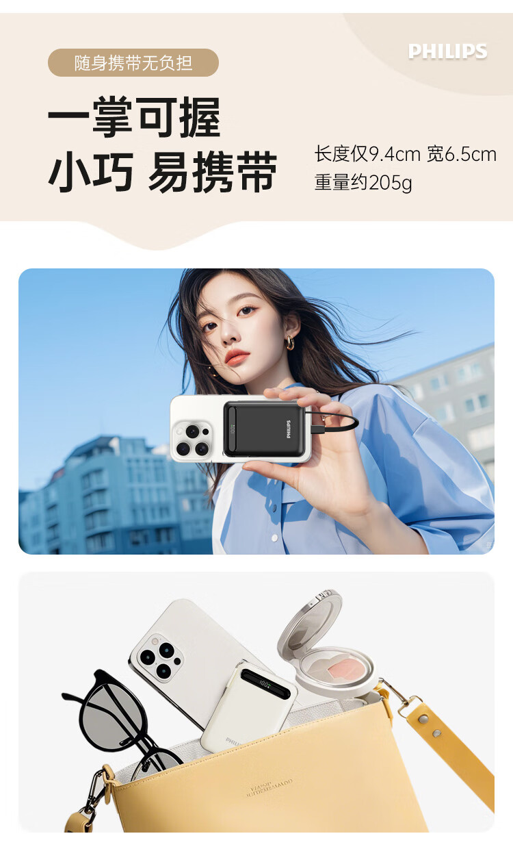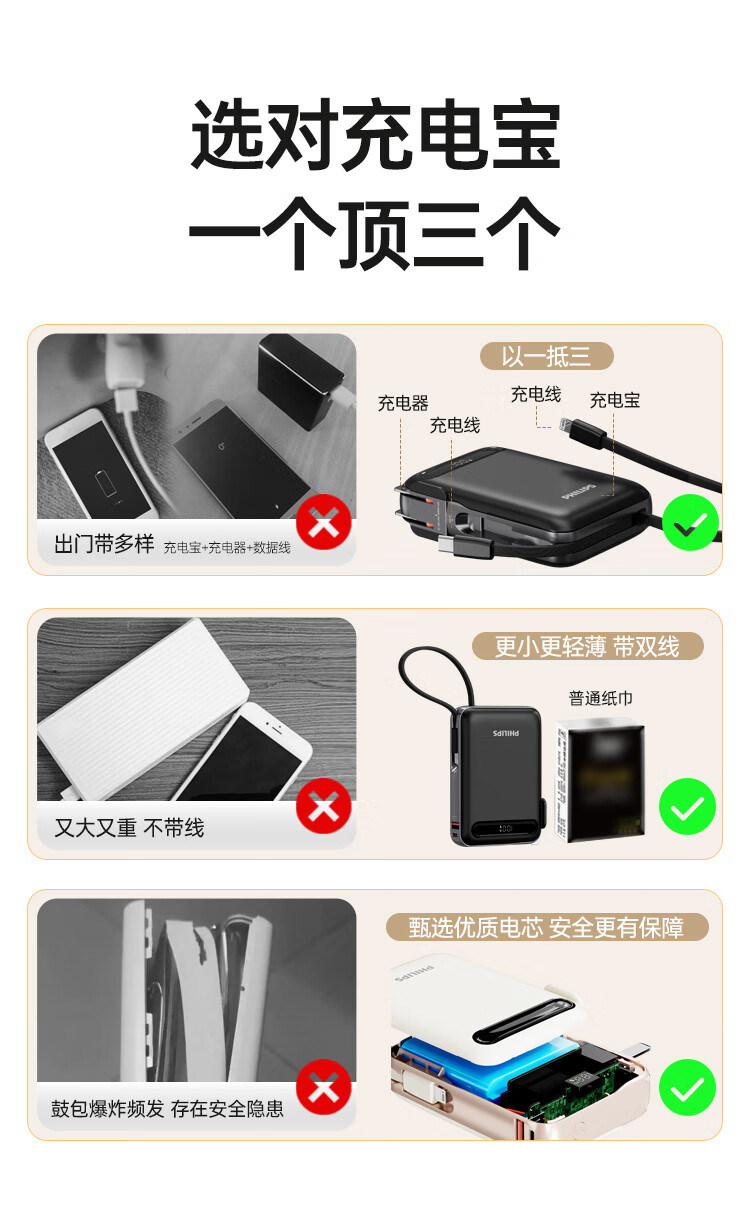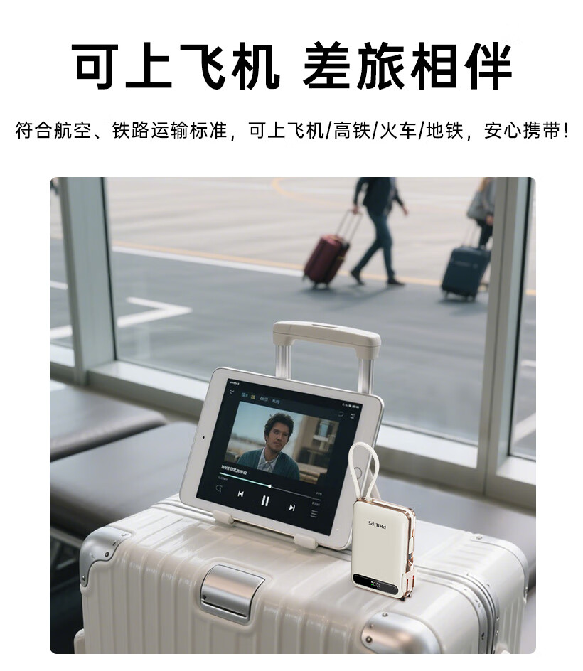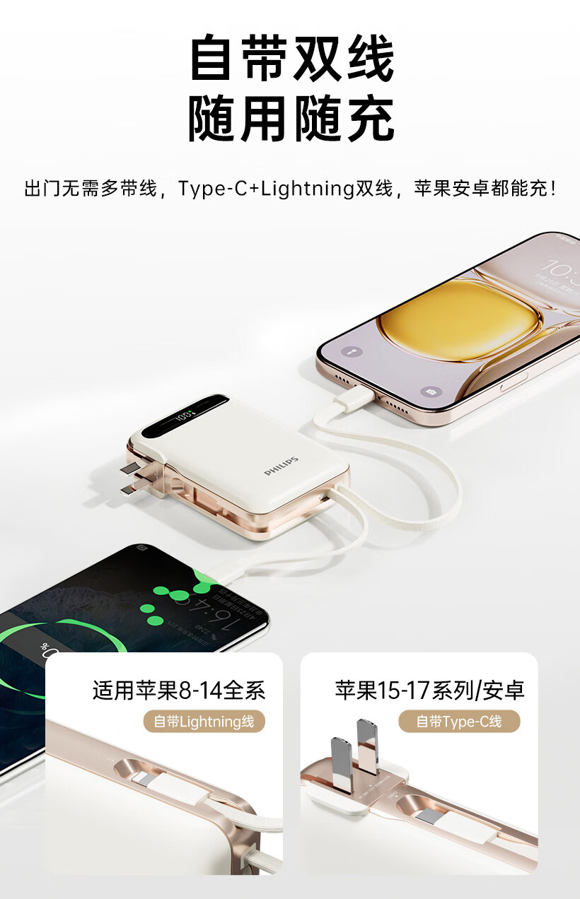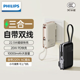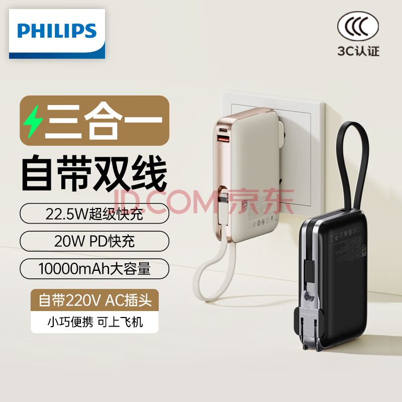 飞利浦三合一充电宝3C认证可上飞机自带双线插头10000毫安小巧便携22.5W快充大容量移动电源适用苹果小米