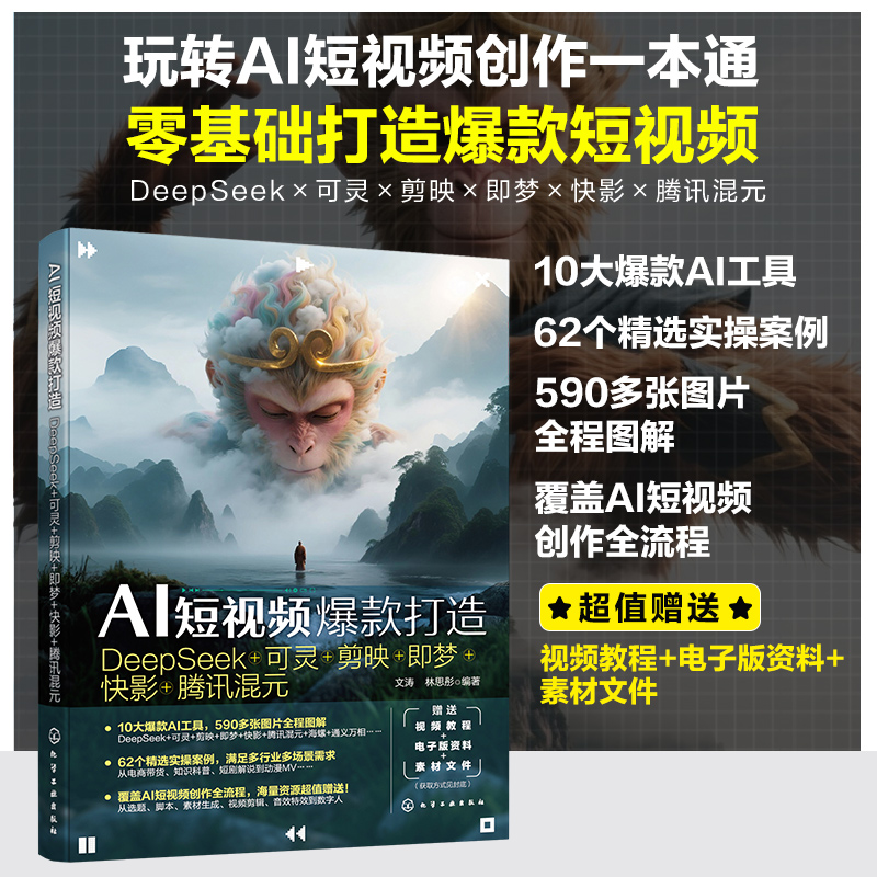 2.10款精选AI工具,覆盖全流程创作:本书从10款AI工具出发,构建一个完备的短视频创作生态体系,全面覆盖了创作全流程,从脚本生成到剪辑优化,从创意激发到实现,全方位满足短视频创作需求,帮助读者快速掌握核心技能。