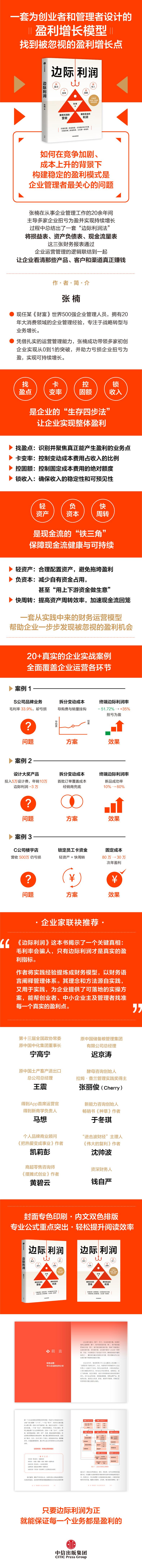 本书的核心理念是“边际利润”——企业经营的真实盈亏锚点。围绕这一概念,作者构建了一整套财务运营逻辑模型,从“找盈点、卡变率、降固额、锁收入”到 “轻资产、负资本、快周转”,层层递进地剖析企业盈利的底层逻辑,助力中小企业摆脱低效运营,迈向精细化管理。