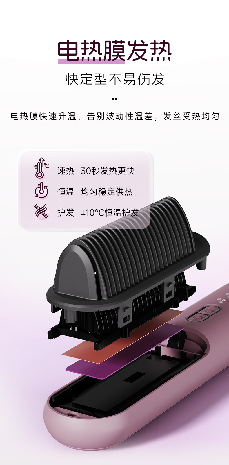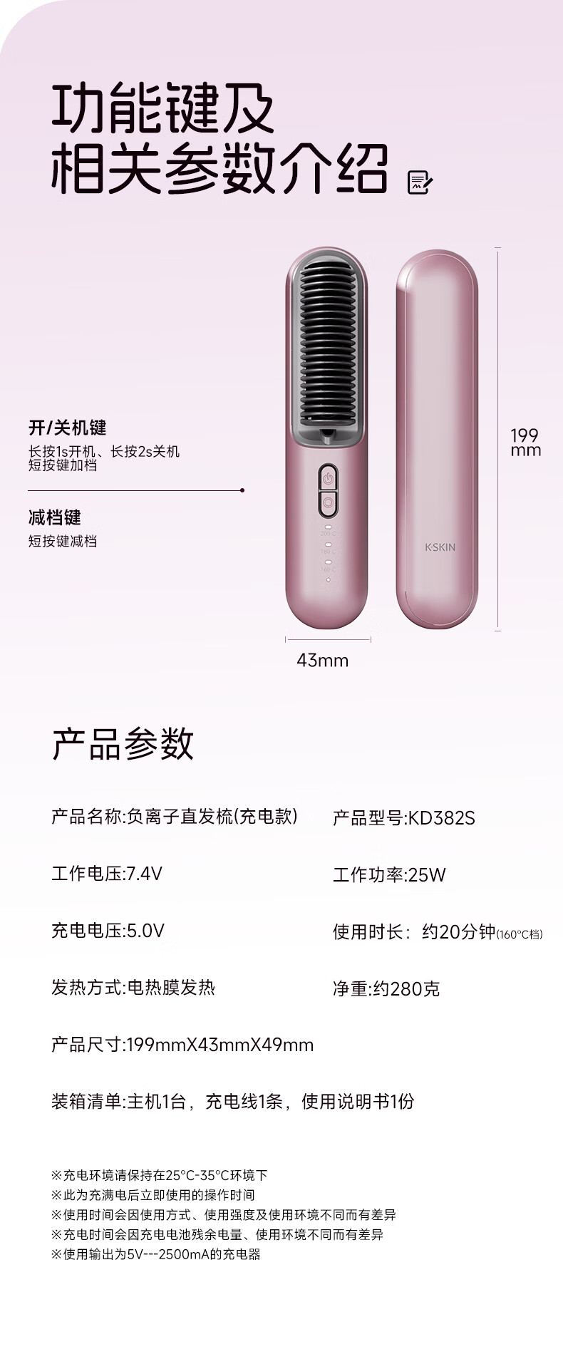 金稻无线直发梳便携六千万负离子改善毛躁夹板短发卷发棒高颅顶蓬松电梳子充电款KD382S紫色圣诞节礼物