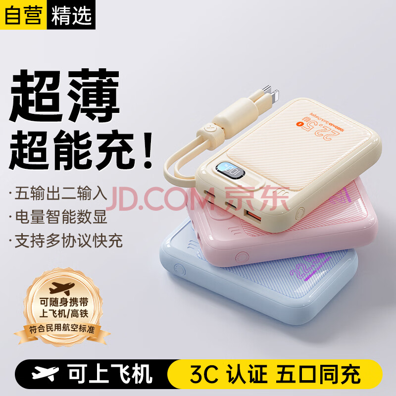 科沃【热销百万】充电宝自带线3C认证可上飞机22.5W超级快充迷你薄小巧便携式大容量适用华为苹果小米