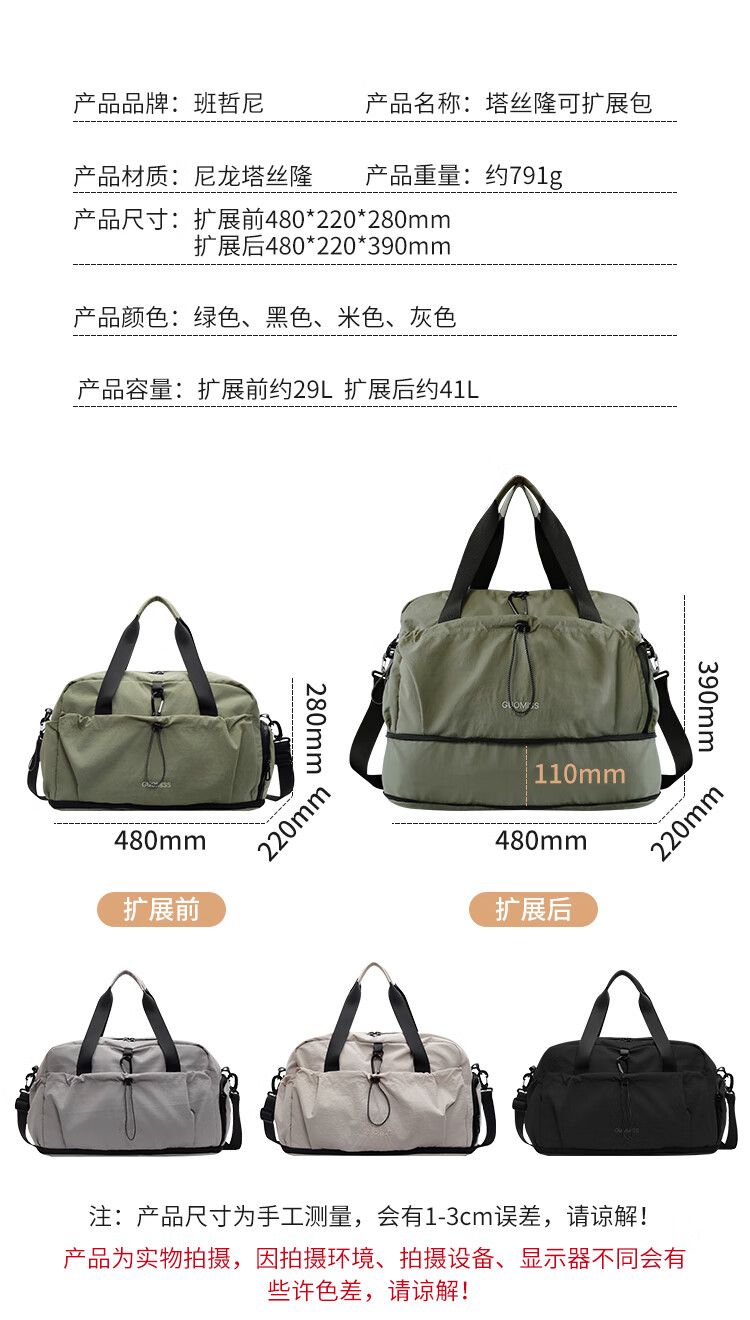 班哲尼旅行包男女士大容量扩展可套拉杆行李箱收纳待产包健身手提斜跨袋