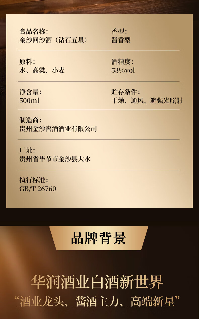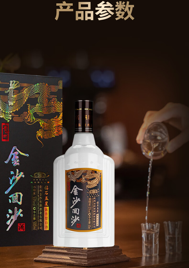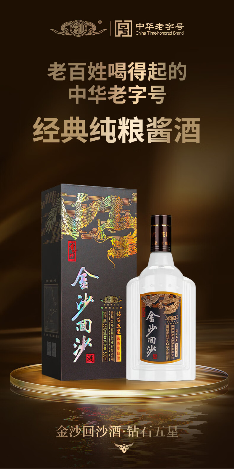 金沙回沙酒 钻石五星 酱香型白酒 53度 500ml*6瓶 整箱装 纯粮食酱酒
