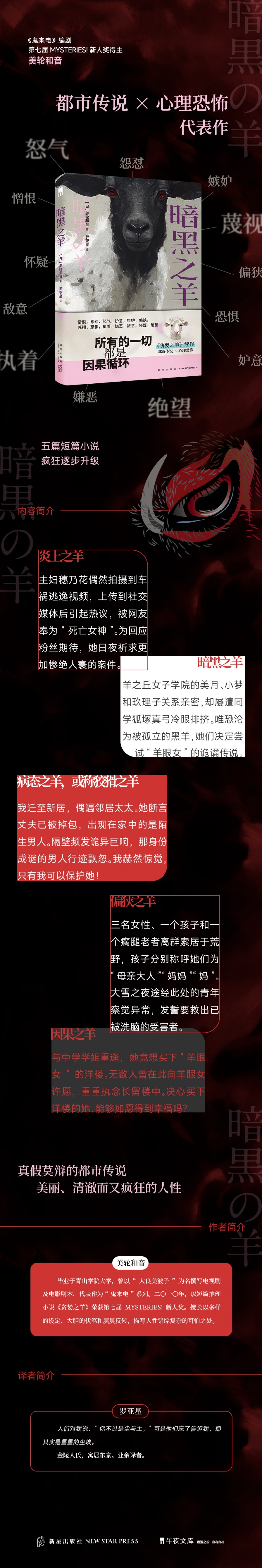 本书为短篇推理小说集,为《贪婪之羊》续作,以都市传说为悬念,给予其符合科学道理的合理解答。日本流传着“羊眼女”的传说:在郊区洋楼六角房间里说三次愿望,一周内“羊眼女”便会实现你的愿望。五个故事在此背景下展开:渴望借极端事件博眼球的年轻主妇、互相厌恶的高中生、坚信家中丈夫是陌生人的邻居太太、以“母女”相称却困于畸形关系的四人、试图买下洋楼的老同学。当不幸接连发生,众人看似独立的愿望竟彼此交织,而贯穿其中的黑濑果步子始终坚守正义之光,在扭曲的人性迷雾中探寻真相,原来理性与善良才是一切的救赎。