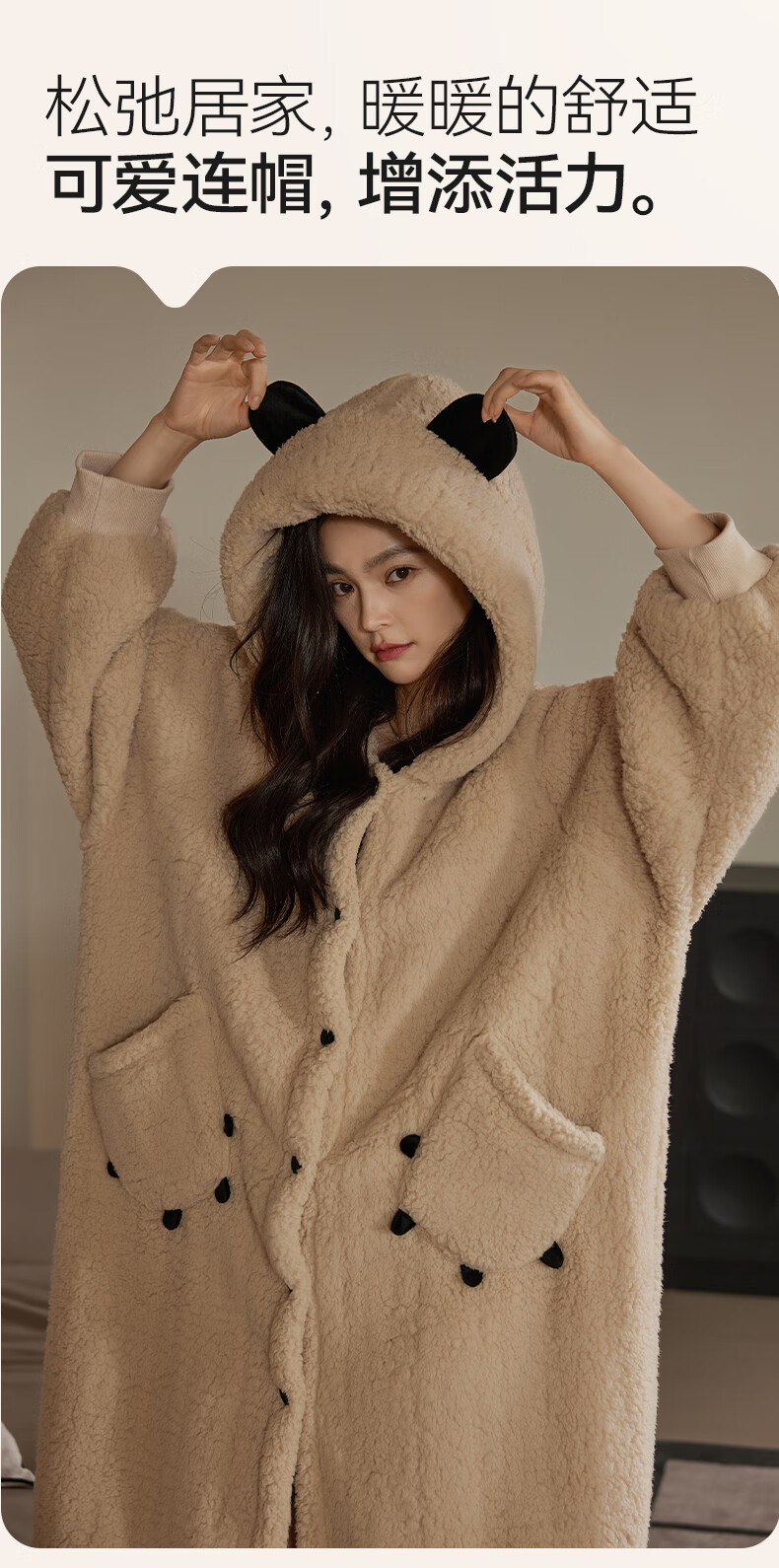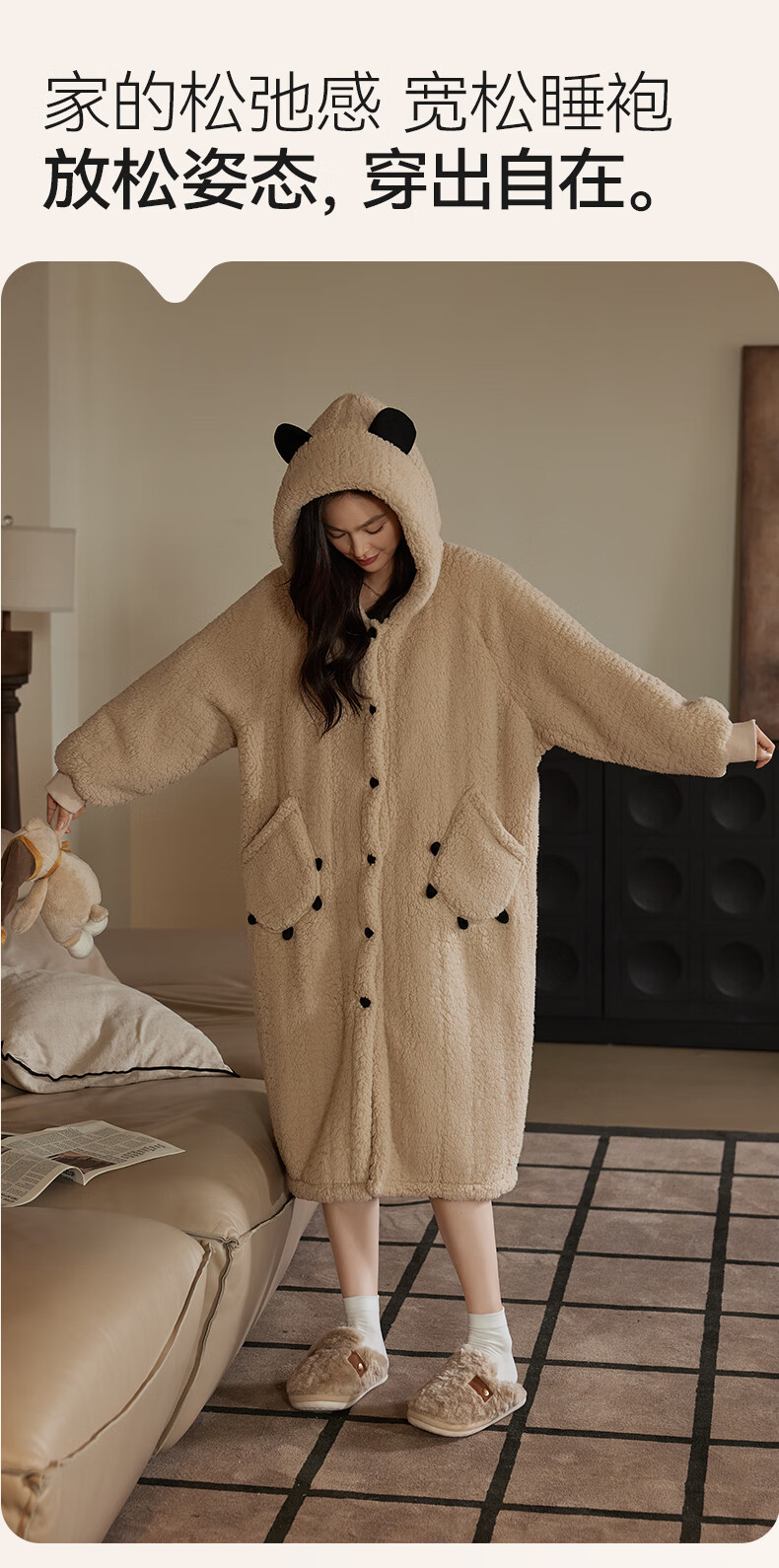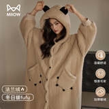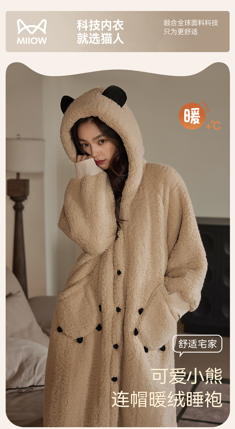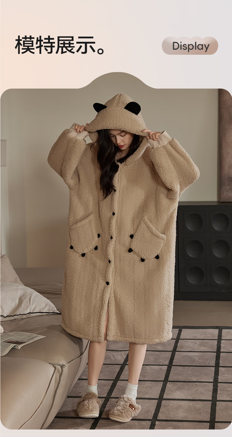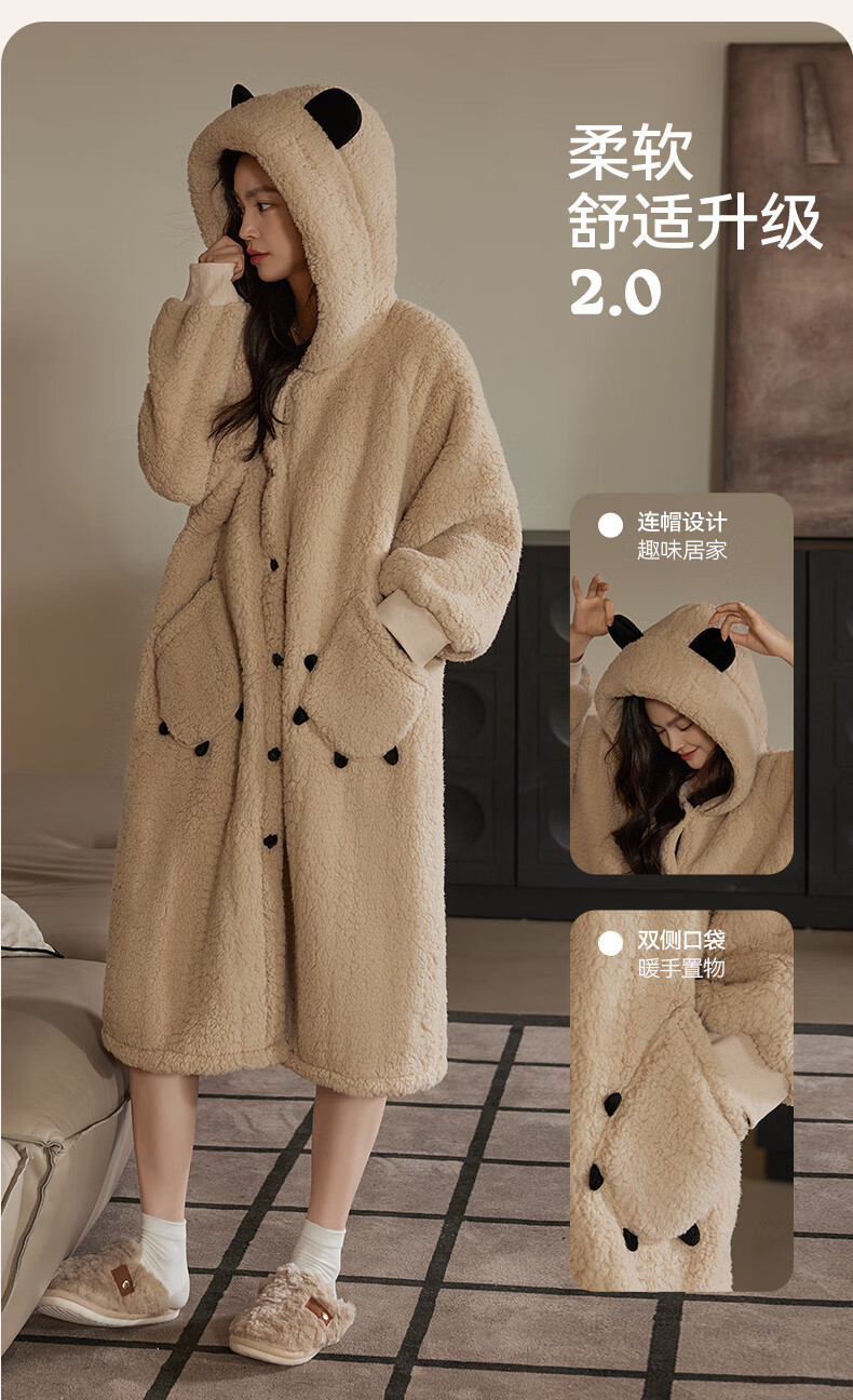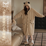 猫人小熊珊瑚绒睡袍女秋冬加绒加厚睡衣长袍可外穿可爱女士家居服套装