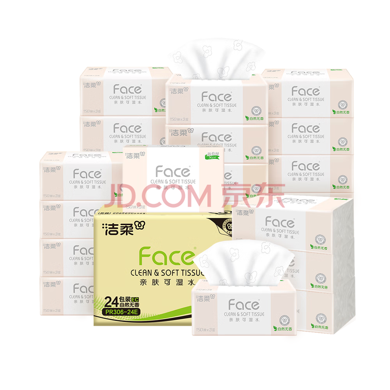 洁柔抽纸 粉Face柔韧3层150抽*24包 S码 可湿水不易破卫生纸 整箱纸巾