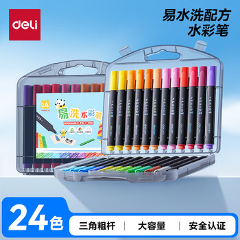 得力24色小黑盒易洗易清洗水彩笔熊猫粗三角杆学生儿童画画涂色美术绘画礼物HM662-24