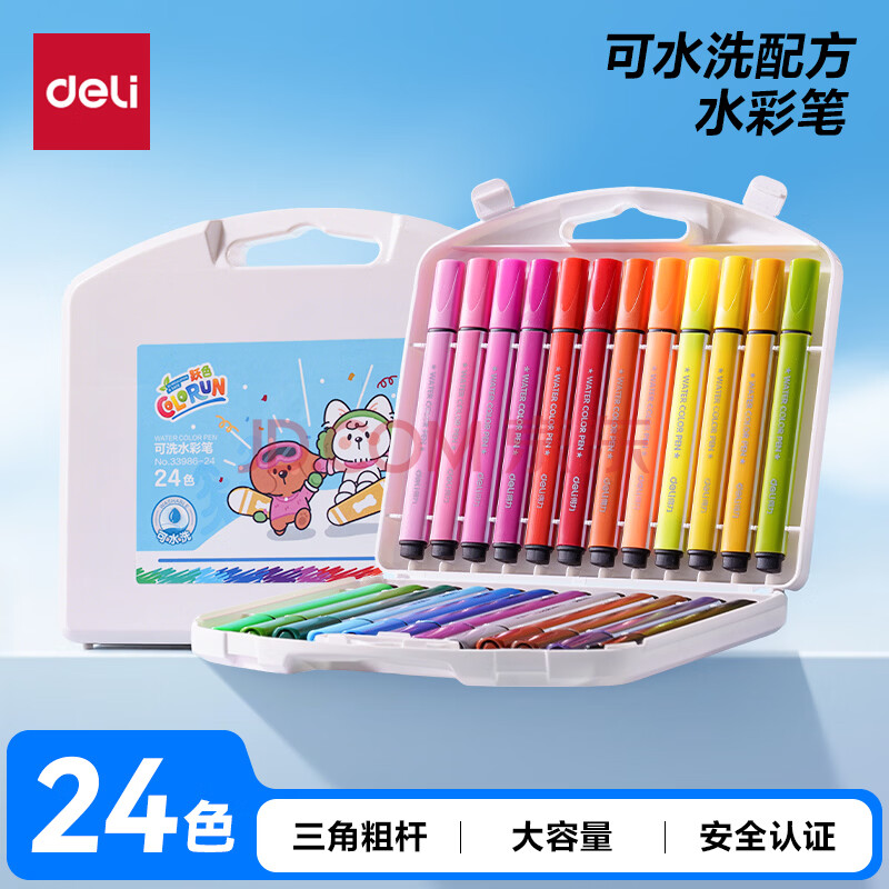 得力24色可水洗水彩笔易握粗三角学生儿童涂色颜色马克笔画笔套装文具女孩儿童礼物