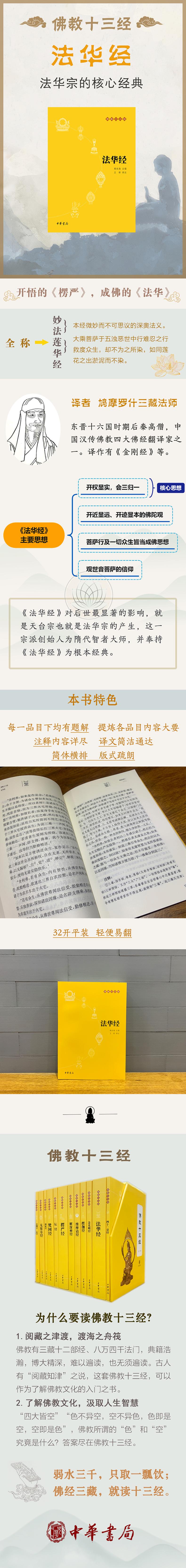国以人为本,人以心为本。和谐人文,清净人心。 1.与儒家“十三经”一样,“佛教十三经”所收入的是浩瀚佛经中*经典的十三部经书。 2.本套佛经是国内**套原文、题解、注释、译文兼具的“佛教十三经”,适合广大喜爱阅读佛经的普通读者阅读。 3.本套丛书主编赖永海先生在佛教界素有“北方(方立天)南赖(赖永海)”之称,为南京大学博士生导师,是“赖家军”的“领军人物”,在中国佛教界具有很高的知名度。
