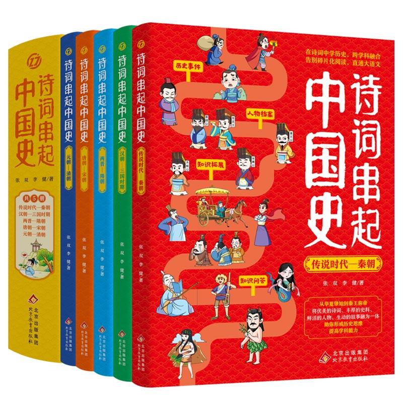 《诗词串起中国史(共5册)》精选了可以反映传说时代、秦汉、三国、两晋、隋唐、宋元清等历史时期的重要诗词歌赋作品,以作品为桥 梁,以趣味漫画和幽默的语言为媒介,追溯中华历史源头,将独特的民风民俗和重要的历史人物与事件凝练,力求让青少年读者在感受中 华诗词之美的同时,领略历史的浩浩汤汤。书中设置了“历史世系图”“诗词原文(节选)”“历史人物”“历史事件”“趣味小知识”“历史 大闯关”“悄悄告诉你”7大板块,旨在让青少年读者能从诗词之中更加全面完整地掌握更多历史文化知识,提升文学史学素养。