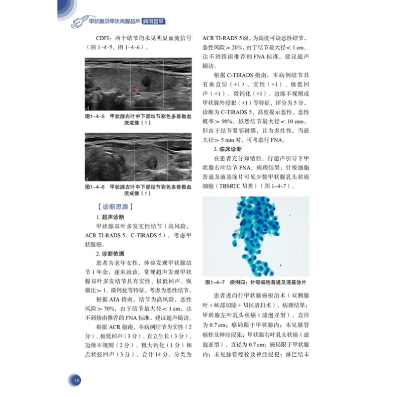 第一章? 甲状腺乳头状癌………………………………………………………………… 1第二章? 甲状腺滤泡癌……………………………………………………………………41第三章? 甲状腺髓样癌……………………………………………………………………53第四章? 甲状腺低分化癌…………………………………………………………………63第五章? 甲状腺未分化癌…………………………………………………………………71第六章? 甲状腺淋巴瘤……………………………………………………………………75第七章? 甲状腺鳞状细胞癌……………………………………………………………… 85第八章? 甲状腺转移癌……………………………………………………………………91第九章? 结节性甲状腺肿…………………………………………………………………97第十章? 甲状腺滤泡性腺瘤…………………………………………………………… 109第十一章? 亚急性甲状腺炎…………………………………………………………… 123第十二章? 自身免疫性甲状腺炎(桥本甲状腺炎)………………………………… 131第十三章? Riedel 甲状腺炎? ………………………………………………………… 137第十四章? IgG4 相关性桥本甲状腺炎? ……………………………………………… 143第十五章? 甲状腺结核………………………………………………………………… 147第十六章? 朗格汉斯细胞肿瘤………………………………………………………… 151第十七章? 甲状腺癌合并其他部位肿瘤……………………………………………… 157第十八章? 异位甲状腺及合并病变…………………………………………………… 165第十九章? 甲状腺癌淋巴结转移……………………………………………………… 171第二十章? 超声引导下细针穿刺术…………………………………………………… 177第二十一章? 甲状腺结节超声引导下的微创治疗…………………………………… 193第二十二章? 术后持续 / 复发甲状腺癌的评估? …………………………………… 211第二十三章? 甲状旁腺增生…………………………………………………………… 223第二十四章? 甲状旁腺腺瘤…………………………………………………………… 231第二十五章? 高分化甲状旁腺腺癌…………………………………………………… 249
