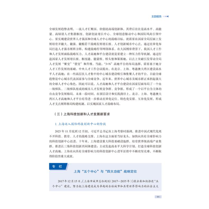 主题报告一、上海科技工作者队伍建设的形势需求..................................................................3(一)全球科技创新和人才发展新形势....................................................................................31. 全球新一轮科技革命和产业变革加速演进 ..............................................................32.复杂的国际形势及地缘冲突加剧全球人才竞争 ......................................................6(二)我国科技创新和人才发展新形势....................................................................................81. 我国以高水平科技自立自强支撑引领高质量发展 ..................................................82. 我国开启新时代人才强国战略新征程 ....................................................................10(三)上海科技创新和人才发展新要求..................................................................................111.上海迈入国际科技创新中心新阶段 ........................................................................112. 上海科技工作者队伍建设使命与担当 ....................................................................13二、上海科技工作者队伍建设的状况分析................................................................14(一)科技工作者的内涵与分类...............................................................................................141.科技工作者的内涵 ....................................................................................................142.科技工作者的分类 ....................................................................................................14(二)上海科技工作者数量变化...............................................................................................151.科技工作者总量持续增长 ........................................................................................152. R&D人员数持续增加 ..............................................................................................163.高层次人才规模和贡献力持续提升 ........................................................................17(三)上海科技工作者的队伍结构与分布状况......................................................................201.科技工作者基本结构 ................................................................................................202.科技工作者产业分布 ................................................................................................21(四)上海科技工作者状况调查...............................................................................................221.职业稳定性强 ............................................................................................................232.工作满意度高 ............................................................................................................233.信息获取渠道广 ........................................................................................................234.社会参与意愿强 ........................................................................................................245.未来发展预期好 ........................................................................................................246.城市发展机会多 ........................................................................................................24(五)上海科技工作者国内外比较...........................................................................................251. 全球视角 ....................................................................................................................252. 国内视角 ....................................................................................................................27三、上海科技工作者队伍的建设举措及面临问题.....................................................30(一)建设举措...........................................................................................................................301. 加大引智引才力度 ....................................................................................................302. 构建人才发展平台 ....................................................................................................303. 完善人才发展机制 ....................................................................................................324. 提升人才服务能级 ....................................................................................................33(二)面临问题...........................................................................................................................341.人才队伍结构仍需优化 ............................................................................................342. 人才培养和成长存在障碍 ........................................................................................353. 人才发展体制机制亟须健全 ....................................................................................364. 人才发展生态仍待完善 ............................................................................................37四、上海科技工作者队伍建设的战略取向................................................................39(一)创新人才工作理念思路...................................................................................................391.坚持党对人才工作的全面领导 ................................................................................392.凸显人才引领发展的战略地位 ................................................................................403.聚焦“四个面向”的目标方向 ..................................................