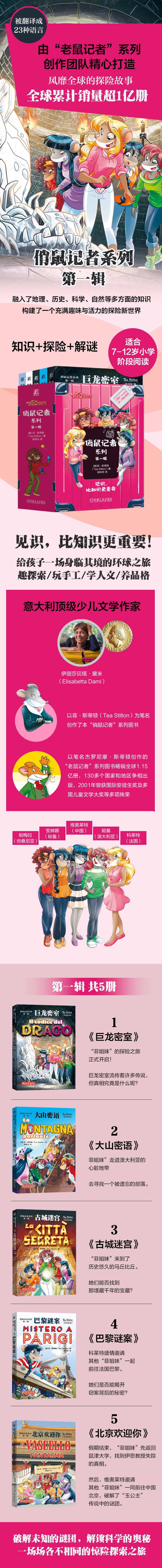 这套“俏鼠记者系列”可以称得上是女孩子们不可不读的探险解谜书。它的主人公是五位魅力四射的女孩子,她们来自不同的国家,她们有着截然不同的性格,有着令人羡慕的友谊,还有着不同寻常的在世界各地探险的经历。她们像是带领冒险队伍的五位小导游,带领孩子们破解一个个谜团,感受各地的风土人情,游览不同的自然风光。