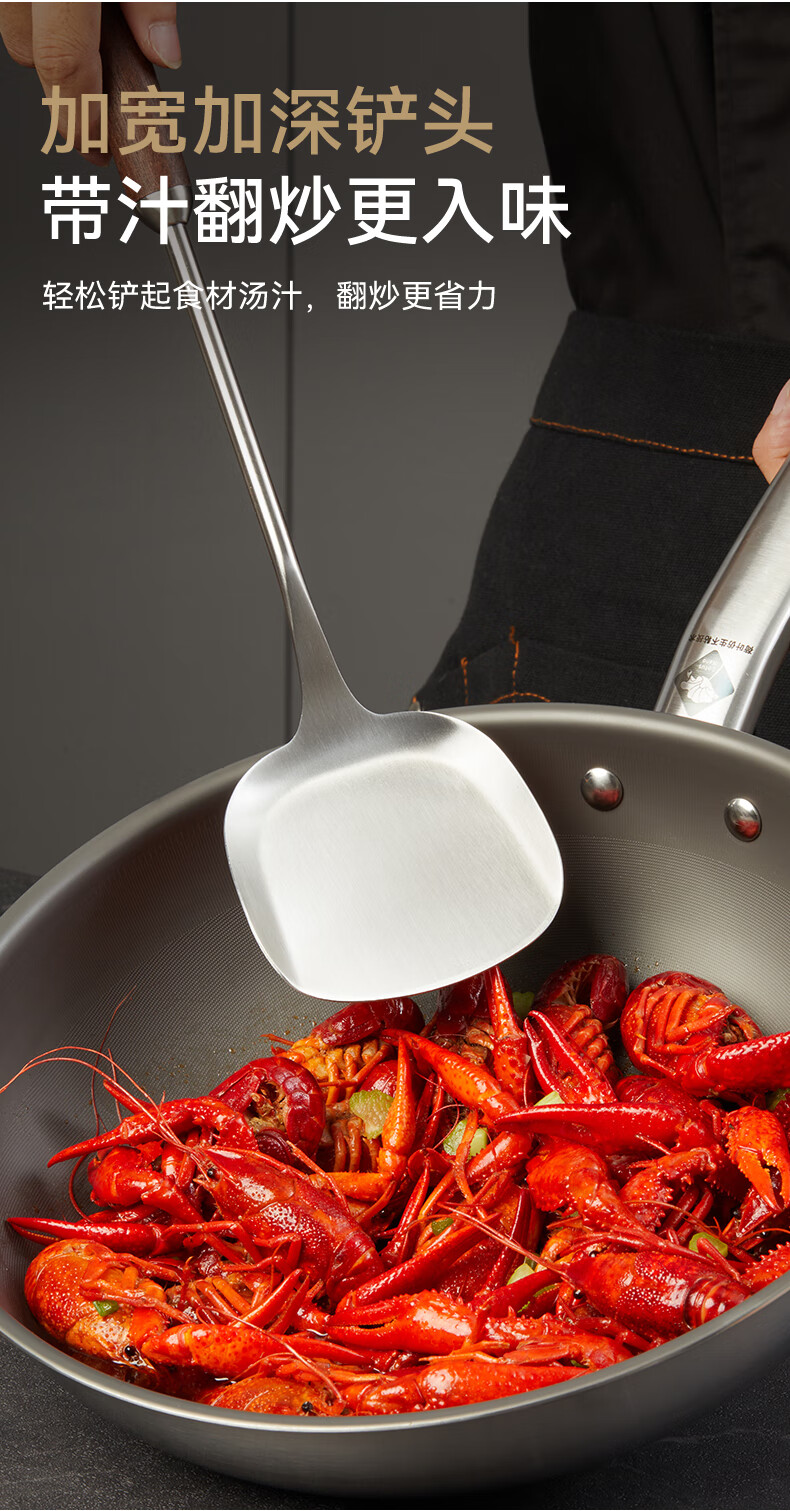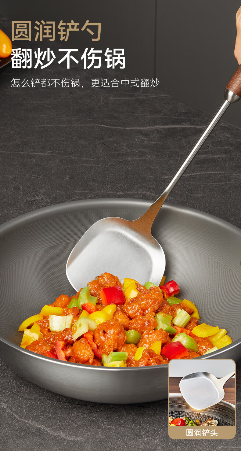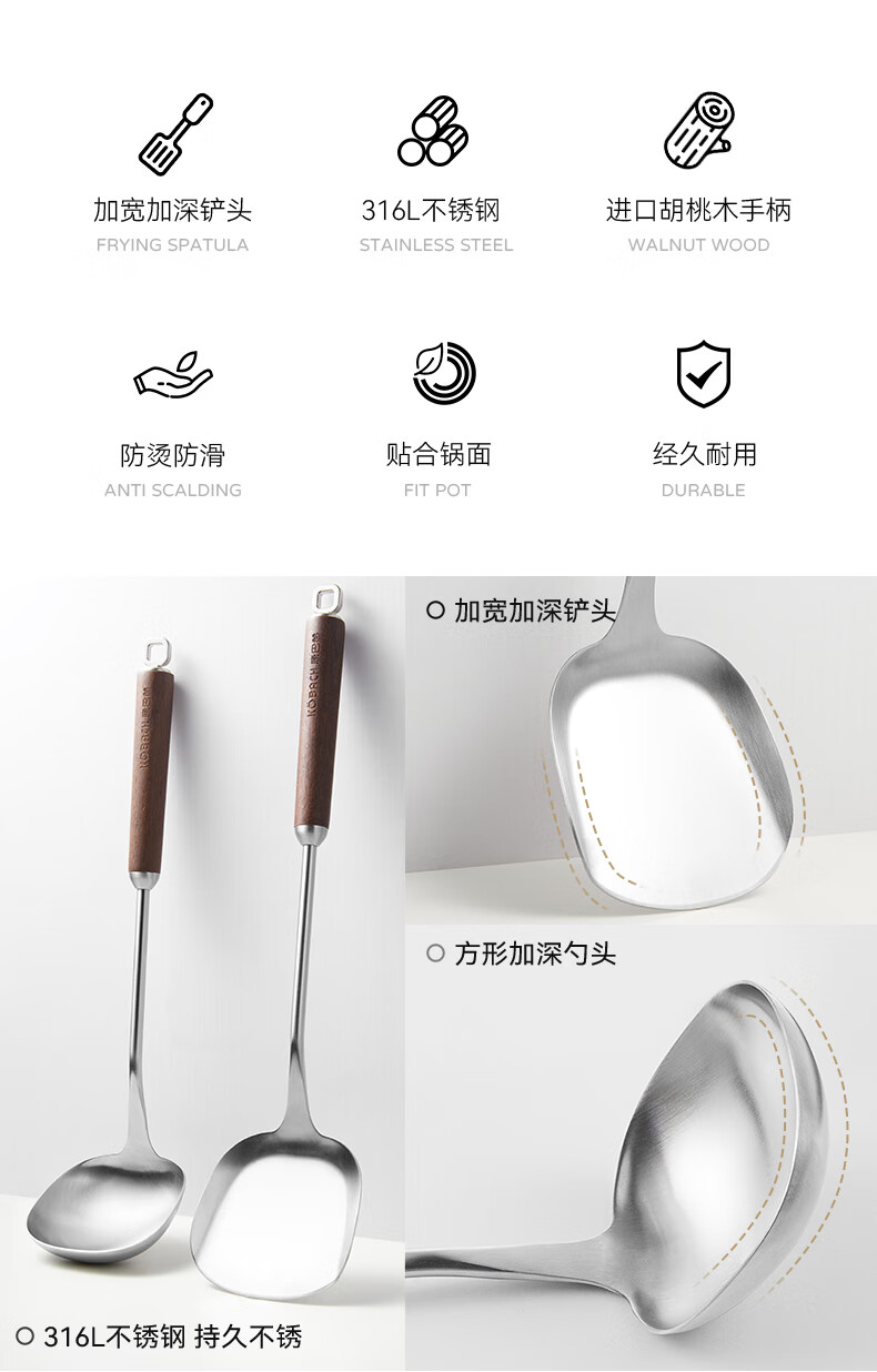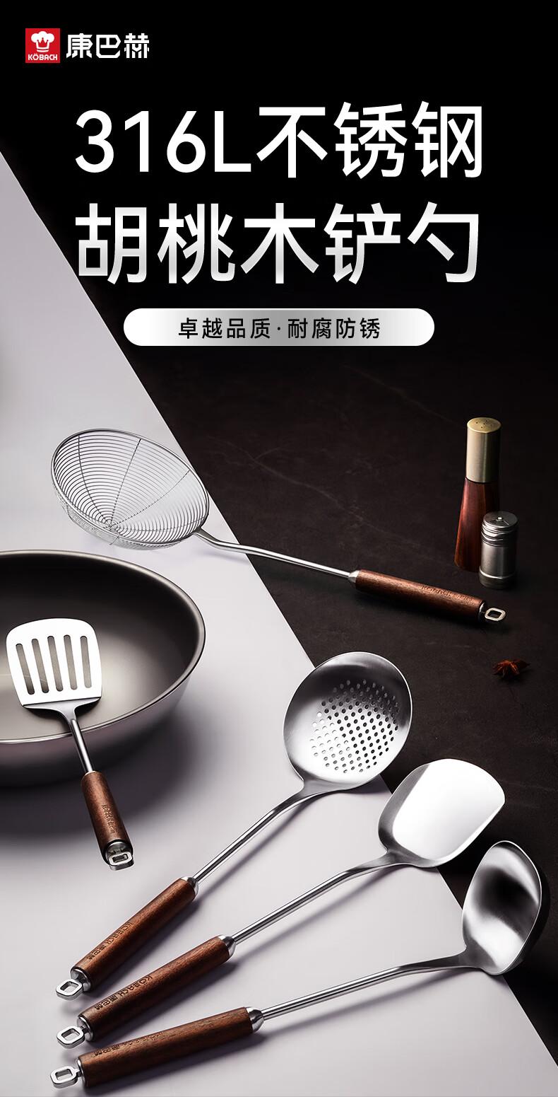 康巴赫316L不锈钢锅铲 加长胡桃木防烫加厚炒菜铲子无涂层锅具炒勺