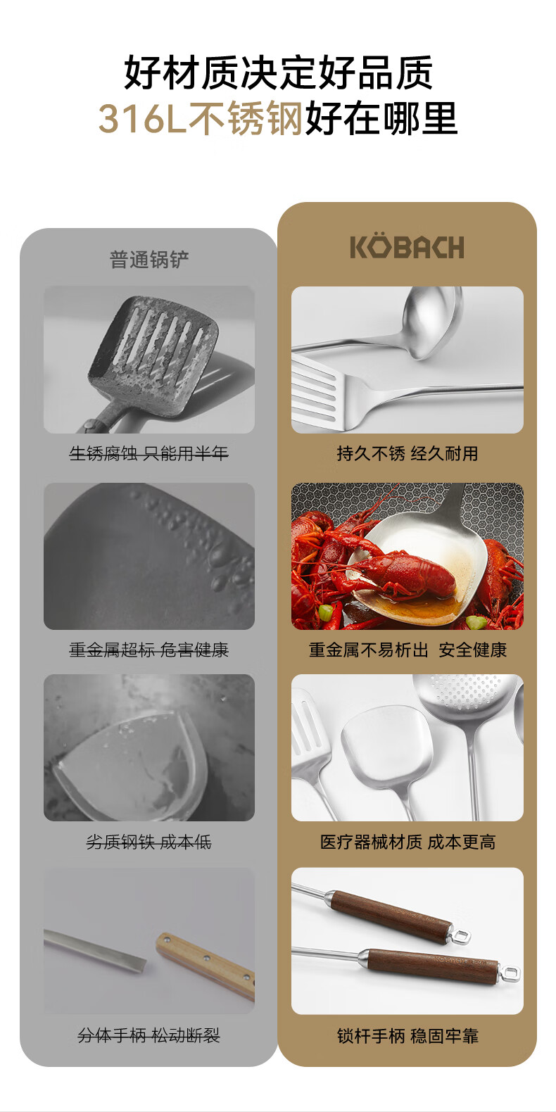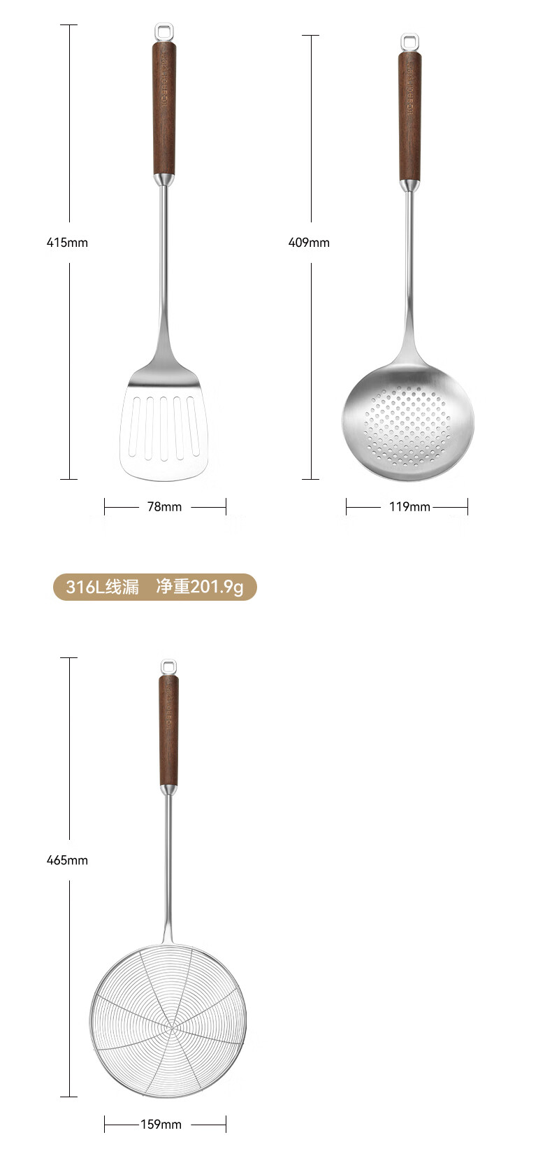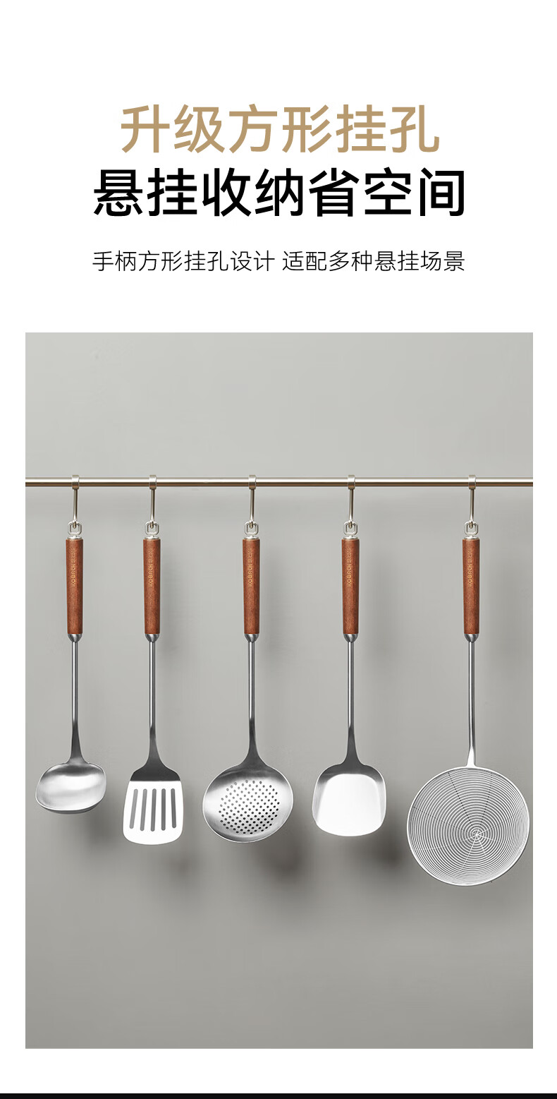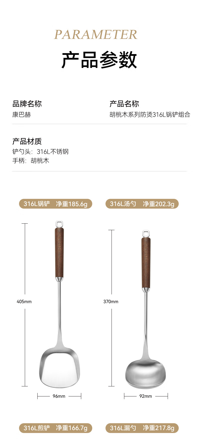 康巴赫316L不锈钢锅铲 加长胡桃木防烫加厚炒菜铲子无涂层锅具炒勺