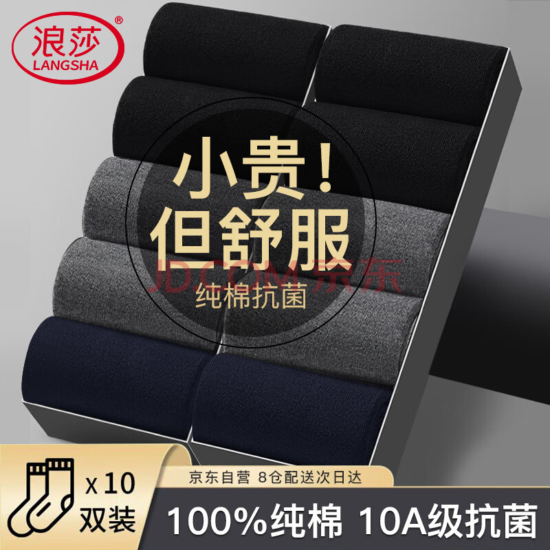 浪莎袜子男10双装秋冬100%纯棉男士中筒商务10A抗菌防臭男袜全棉长袜