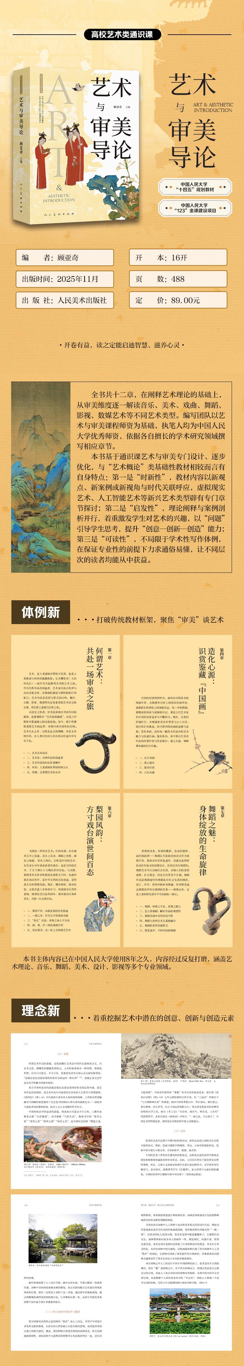 本书基于通识课艺术与审美专门设计、逐步优化,与“艺术概论”类基础性教材相较而言有自身特点:第一是“时新性”,教材内容以新观点、新案例或新视角与时代关联呼应,虚拟现实艺术、人工智能艺术等新兴艺术类型辟有专门章节探讨;第二是“启发性”,理论阐释与案例剖析并行,着重激发学生对艺术的兴趣,以“问题”引导学生思考,提升“创意—创新—创造”能力;第三是“可读性”,不局限于学术性写作体例,在保证专业性的前提下力求通俗易懂,让不同层次的读者均能从中获益。