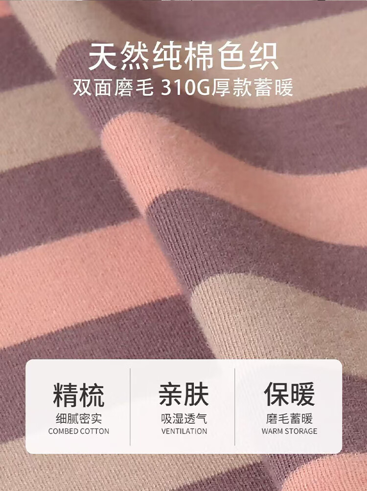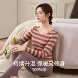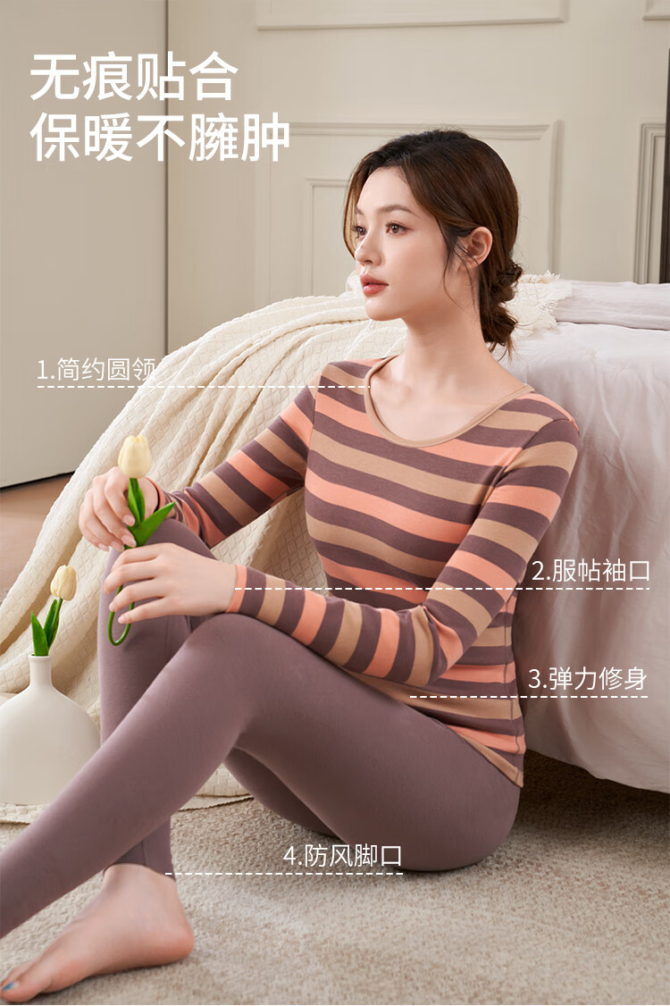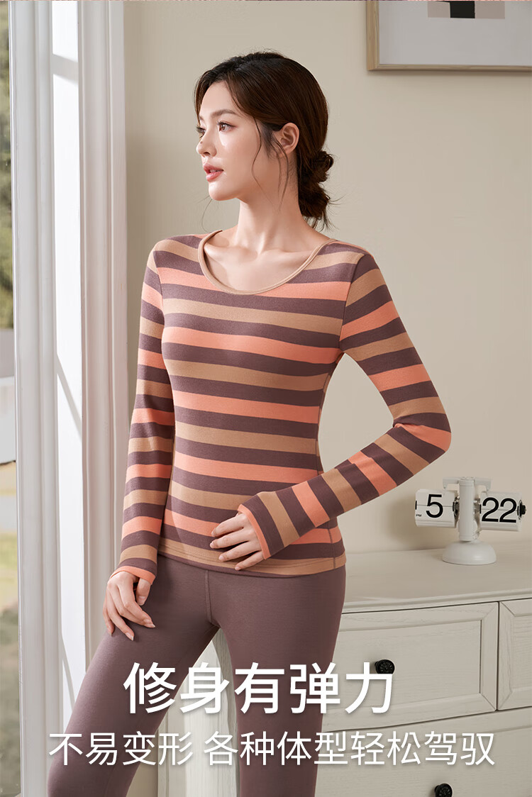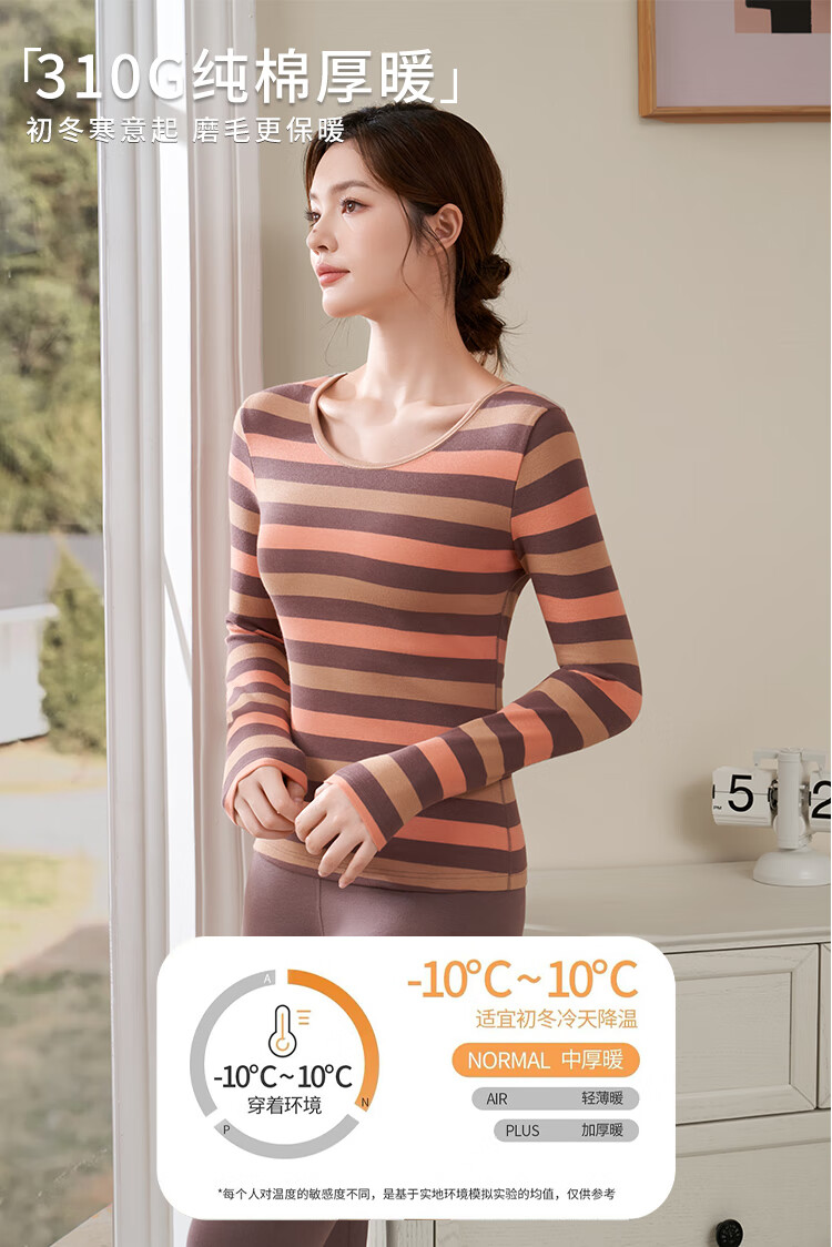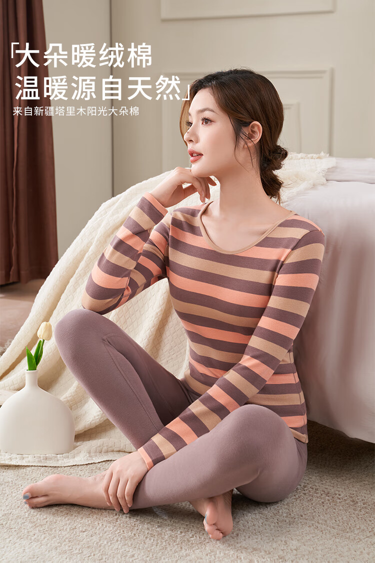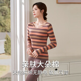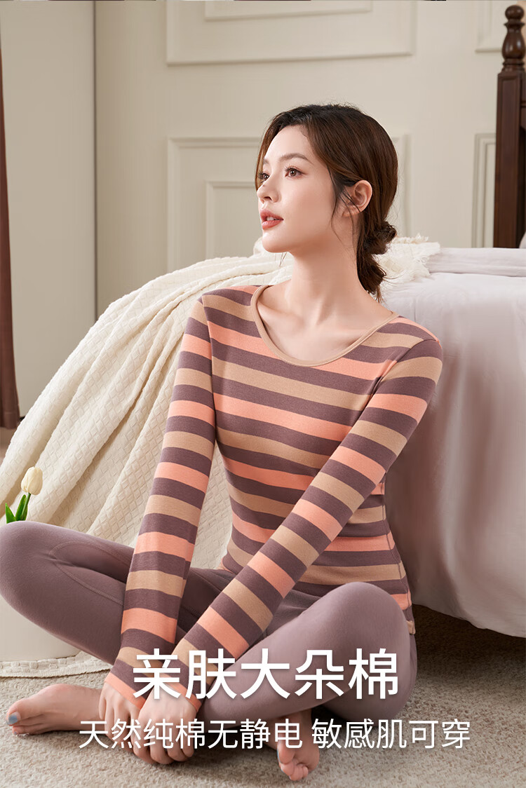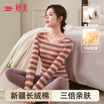 婷美纯棉秋衣秋裤套装女士保暖内衣秋冬季条纹全棉毛衫内搭打底
