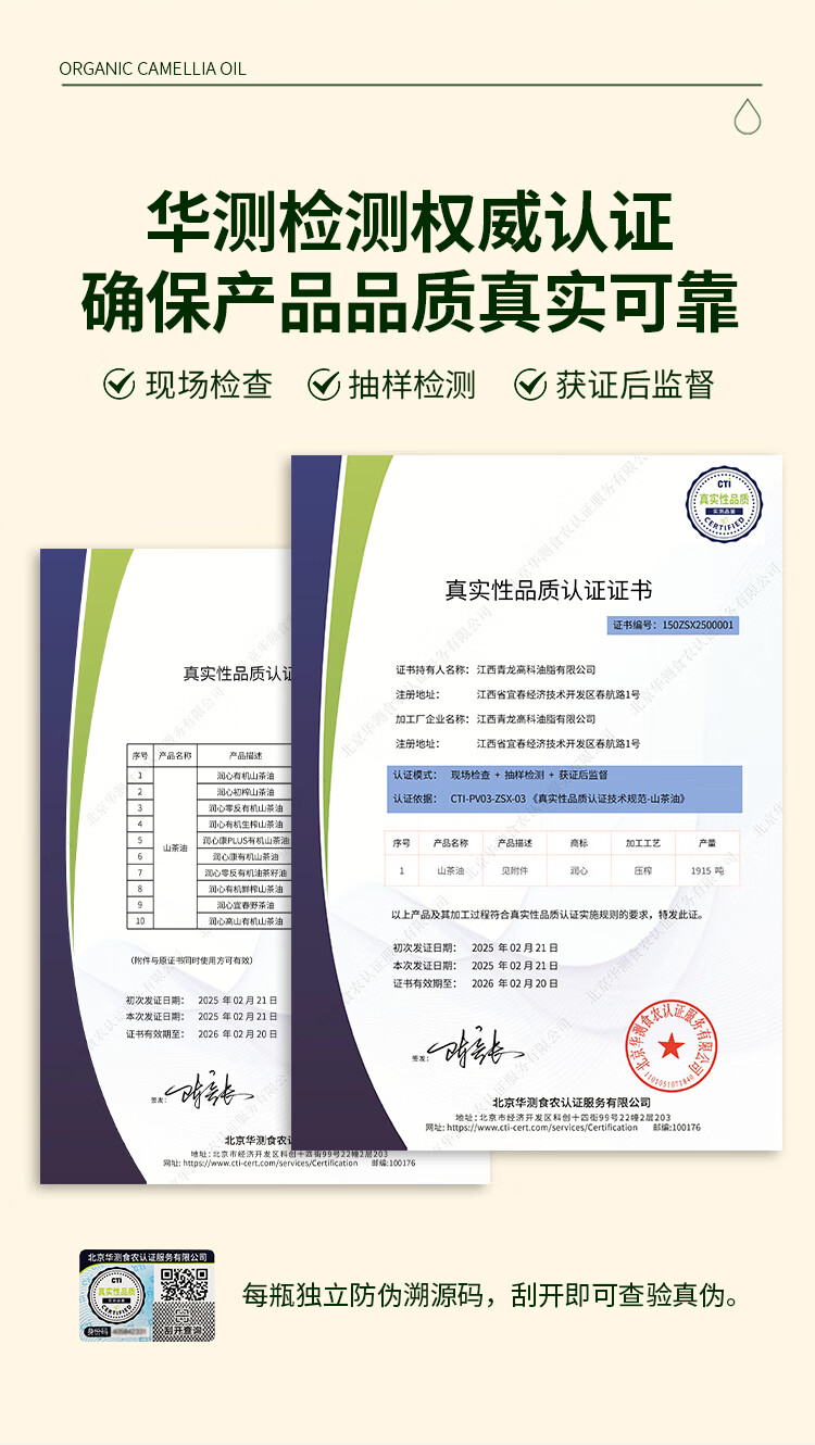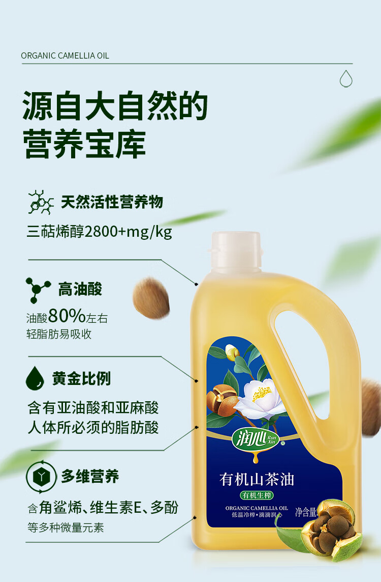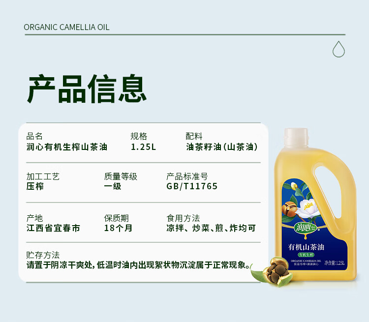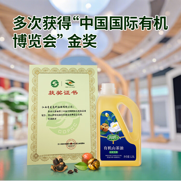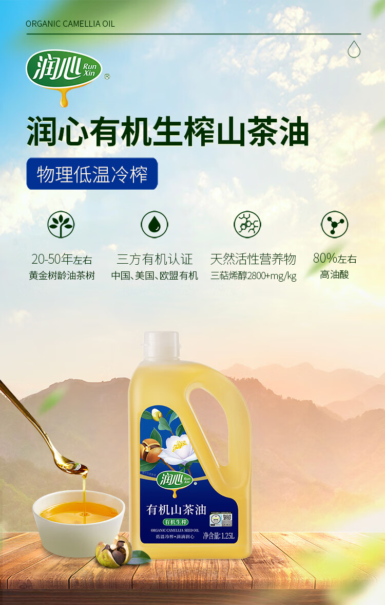 润心【保真山茶油】低温冷榨 一级有机食用油*1.25L