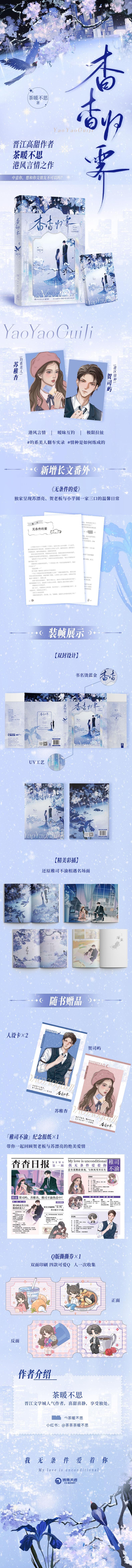 特邀画手绘制主题插画,以“蓝桉树与蓝鹊鸟”为灵感,“贺司屿属蓝桉本性,谁都不放在眼里,就缺苏稚杳这只蓝鹊鸟克克他这雷霆性子。”