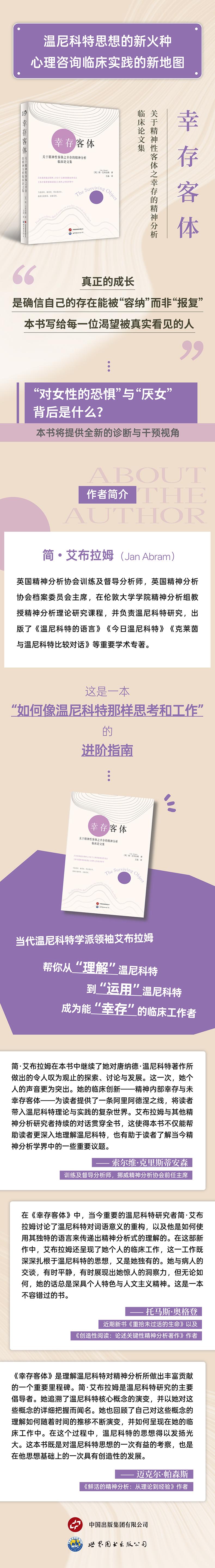 在本书中,艾布拉姆提出并阐述了精神内部幸存客体与精神内部未幸存客体的双重概念;此外,她也详细考察了精神性客体之幸存如何在个体先天因素变得重要之前,将早期母亲/他者放置于个体心灵初始发展的中心地位。艾布拉姆的临床及理论论述进一步发展了温尼科特的几个关键性概念。书中的临床案例也展示出,她对温尼科特理论和临床实践的推动来自于分析情境中的移情与反移情基质。在每一章的递进中,读者将会目睹艾布拉姆理论与临床的沿革,不仅能从中更好地领略温尼科特最初临床范式的风貌,也会更深入地理解温尼科特文本中所蕴含的丰富内容,而这些对于当今临床工作尤为具有启示意义。《幸存客体》包含了八章,涵盖了诸多主题,如“不沟通自体”、“未幸存为根源的震恐”、“欲望的隐含理论”、“厌女背后的对女性的恐惧”、“婴幼儿性欲的意义”、“在新生儿心灵中作为‘完整体’存在的‘哺乳期母亲心智中的父亲’”、“整合之前的无形状态”以及“关于疯狂的理论”。