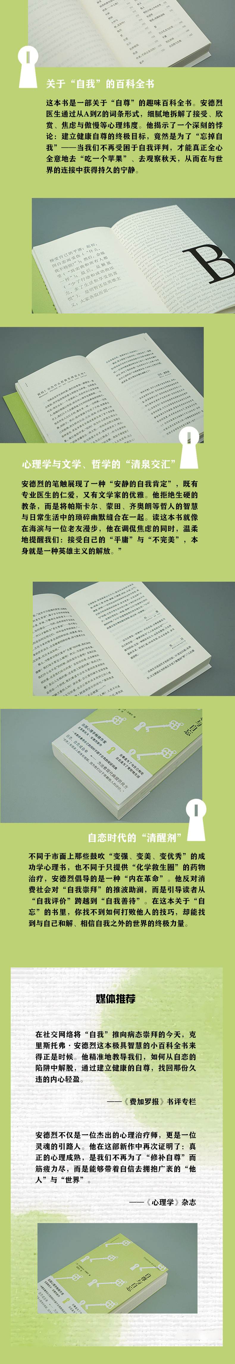 本书由300多个词条组成,好比一个经验丰富的心理医生向我们敞开了他的私人词典,但其中又并不是词典式的写作,而是具有哲学和文学气质的疗愈散文,文体类似罗兰·巴特的《恋人絮语》,适合快节奏阅读。自尊和自忘不仅仅是个心理学问题,它同样是社会问题(比如当代人的自恋病)。这是一本让你思考自己的书。结合心理学、哲学和文学中的财富,以及职业经历和个人生活感悟,克里斯托夫·安德烈的文字一如既往地给读者带来温暖的心理支援。这本书不是一位心理医生在针对各种问题给解决方案,而是像在与读者聊天。他分享自己的观察、感悟、个人经历、心理学知识、文学哲学典故,帮助读者找到正确的平衡的自尊,与自己、他人和世界和谐相处。本书涉及心理学的一个核心概念,自尊,它是人格的基础,该书内容可便于解释当今多种热门概念比如自恋型人格、反驳型人格、抑郁症等。有时辅以心理自助形式的建议,实用性较强。心灵鸡汤般的幽默叙述,可帮读者舒缓心情。在内卷成为常态的今天,重新认识自我、获得平衡的自尊是每个人的功课,这本书可帮助读者获得心灵的平静。该书也对一些心理现象引经据典,引入著名的哲学和文学文本,让读者更容易从熟悉的事物中去理解一些心理学概念,形成一种跨学科的讨论,有利于心理学的普及。总体来说,这是一本可读性很强又有实际社会意义的书,既有心灵疗愈的作用,又富有文学和哲学趣味。