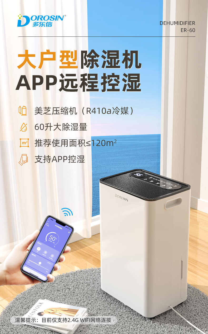 多乐信(DOROSIN)除湿机/抽湿机 60升/天120㎡ APP智控大功率别墅办公室地下室商业家用回南天吸湿干衣除潮 ER-60