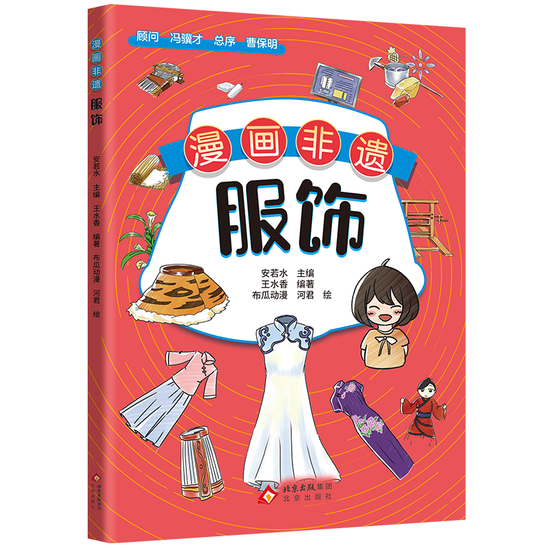 “漫画非遗”丛书为一套4 册,《服饰》《美食》《建筑》《交通》通过4 个主题,用有趣的漫画形式,分别给小朋友们科普10 项非物质文化遗产项目的起源、制作过程和背后的有趣故事。