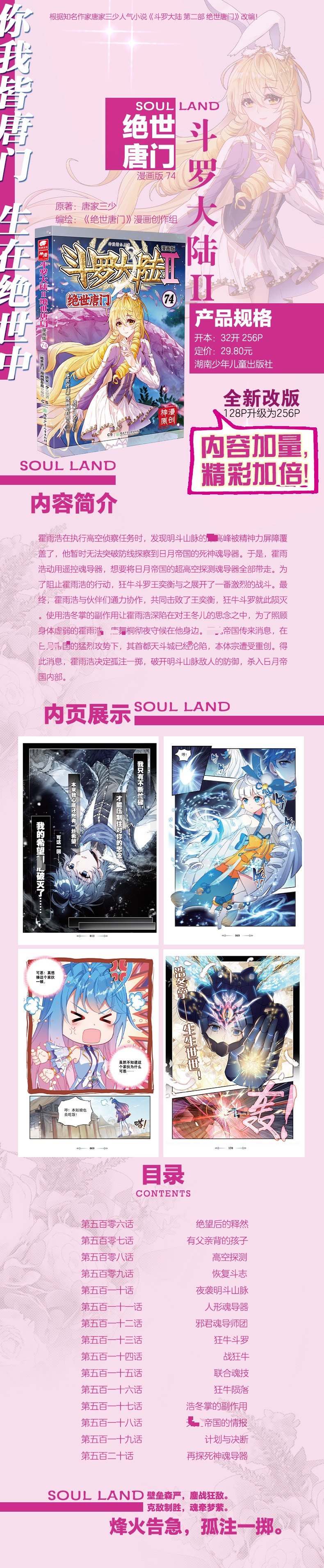 《斗罗大陆II绝世唐门漫画版》根据起点白金作者唐家三少同名小说《斗罗大陆第二部绝世唐门》改编!该小说讲述的是唐门创立万年之后的斗罗大陆上,唐门式微,走出家门的霍雨浩遇到了现任唐门门主唐雅和她的弟子贝贝,随即加入唐门加入大陆最强史莱克学院,在不断的学习中,霍雨浩逐渐激发出自己的潜能,最大限度地发掘了自己的能量,重新振兴唐门,成为了一代天骄!本册主要讲述的是:霍雨浩在经历绝望后重拾信念,与父亲的情感羁绊成为了他前进的动力。霍雨浩团队夜袭明斗山,却遭遇了邪君魂导师团的围剿,众人施展联合魂技力克强敌,最终击败狂牛斗罗化解了危机。然而,浩冬掌的后遗症令霍雨浩陷入危险···关键时刻,天魂帝国前来支援的消息为战局带来了转机,众人调整计划,准备再探死神之地。本册漫画充分展现了主角们在逆境中团结协作、永不言弃的精神。