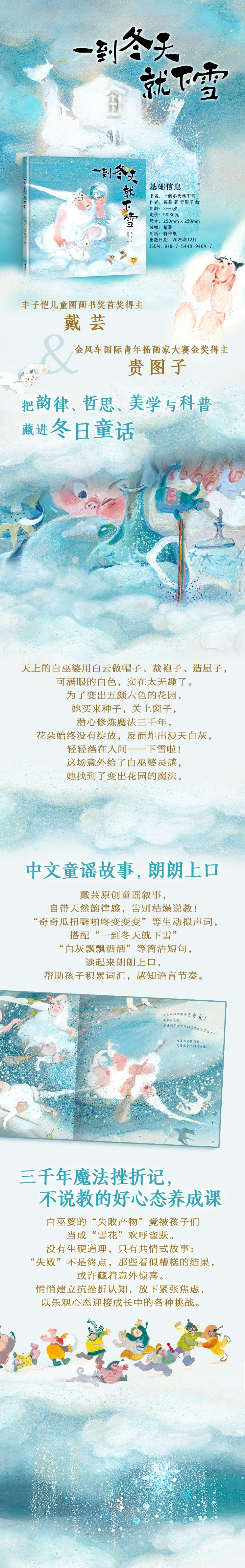 (1)戴芸×贵图子双名家打造,是一本押韵好读的原创童谣故事图画书;(2)水彩丙烯插画兼具童真与东方美学特质,诗意解释“下雪”这一自然现象。(3)书中藏着“接纳不完美、柳暗花明又一村”的温暖与哲思,适合3—6岁亲子共读。