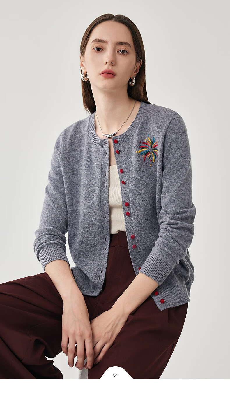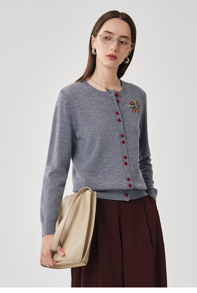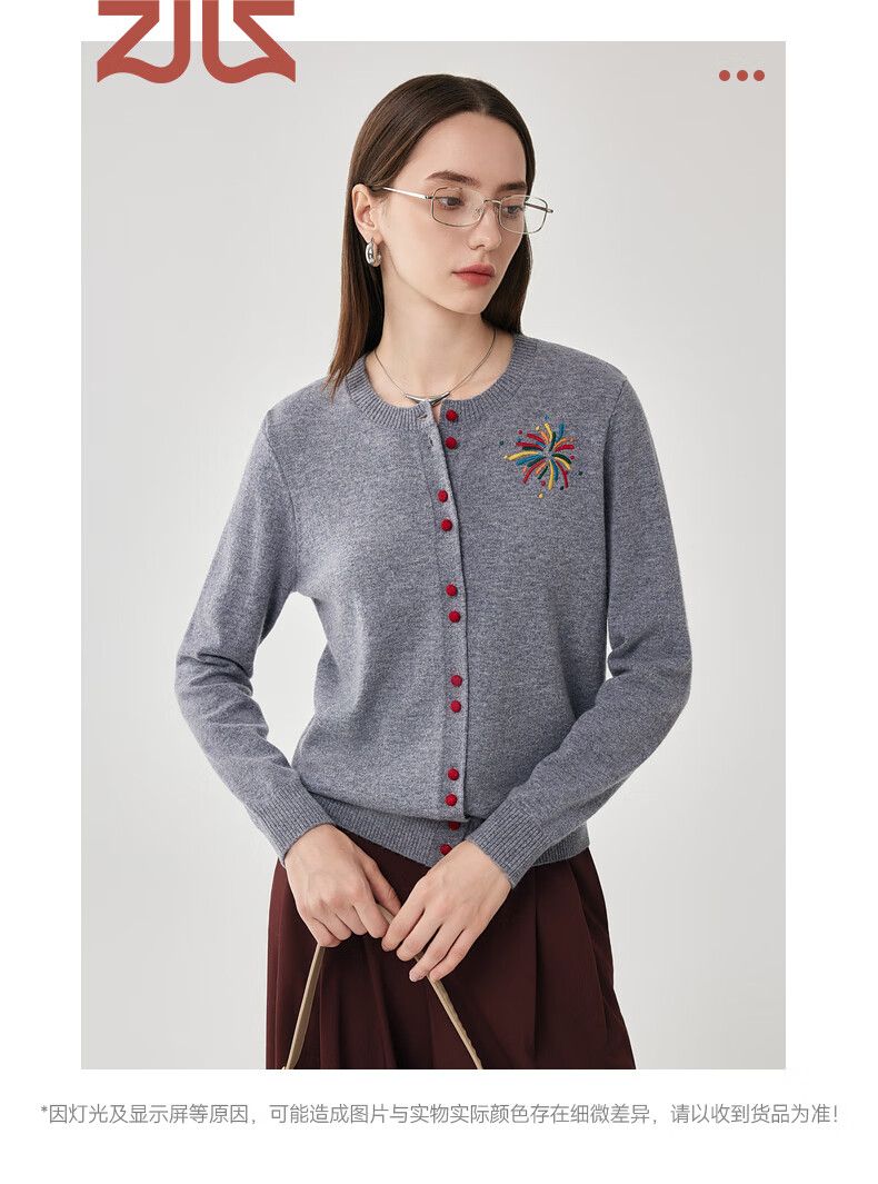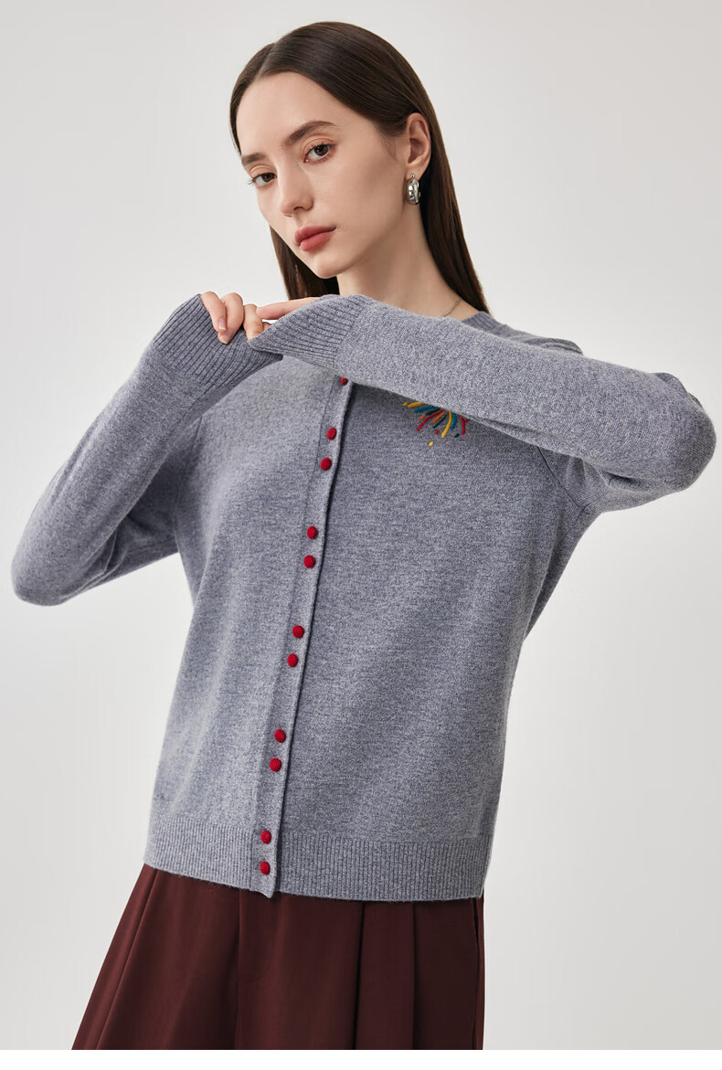 兆君2025秋冬圆领100%羊毛衫女开衫外套撞色针织上衣 石