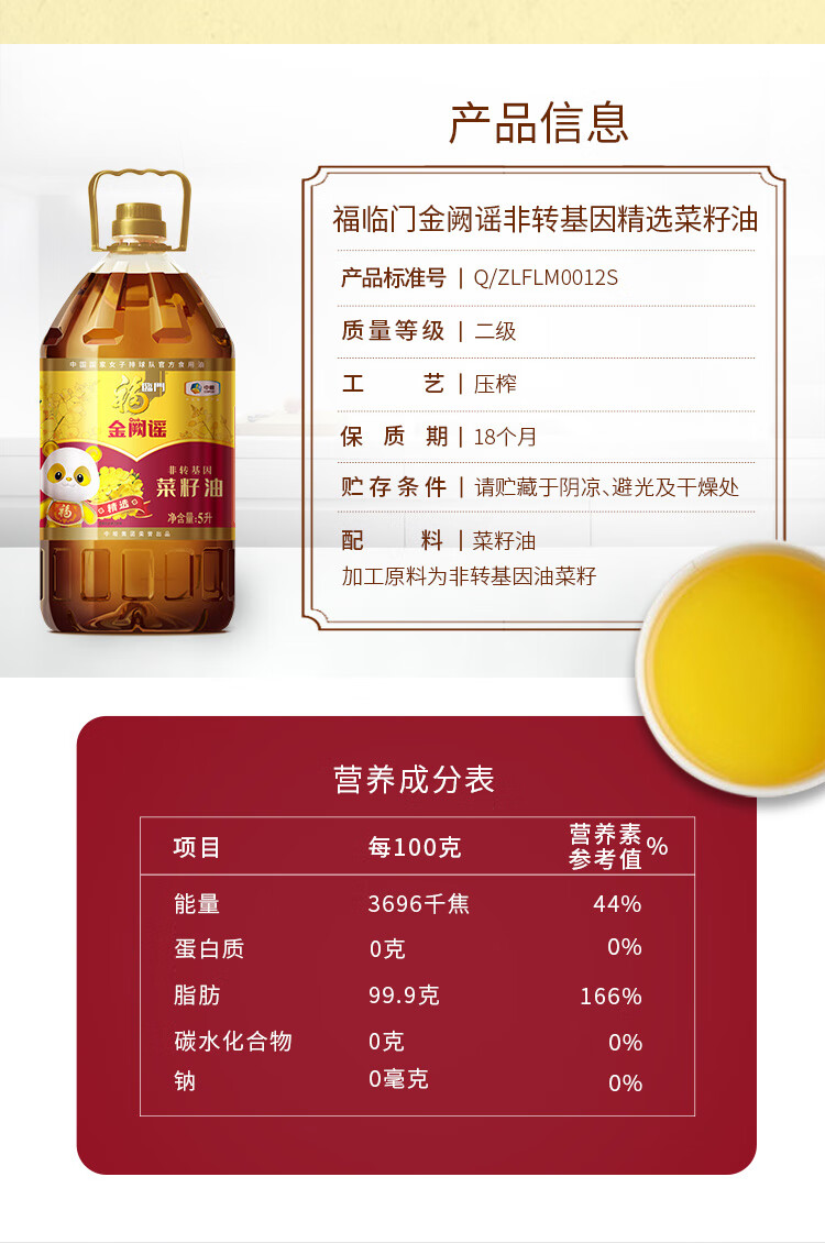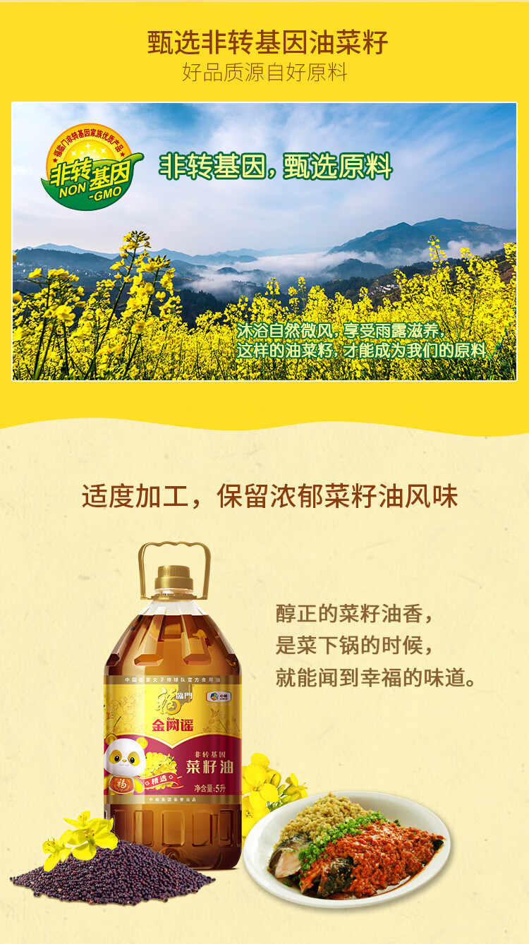 福临门 【东哥同款】 金阙谣 食用油 物理压榨非转基因精选菜籽油5L年货