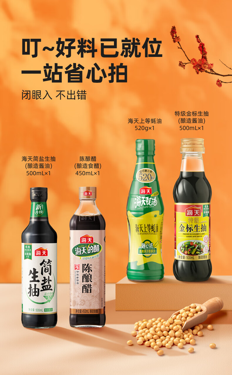 海天 礼盒系列 简盐生抽+金标生抽+蚝油520g+醋450ml 省心拍礼盒