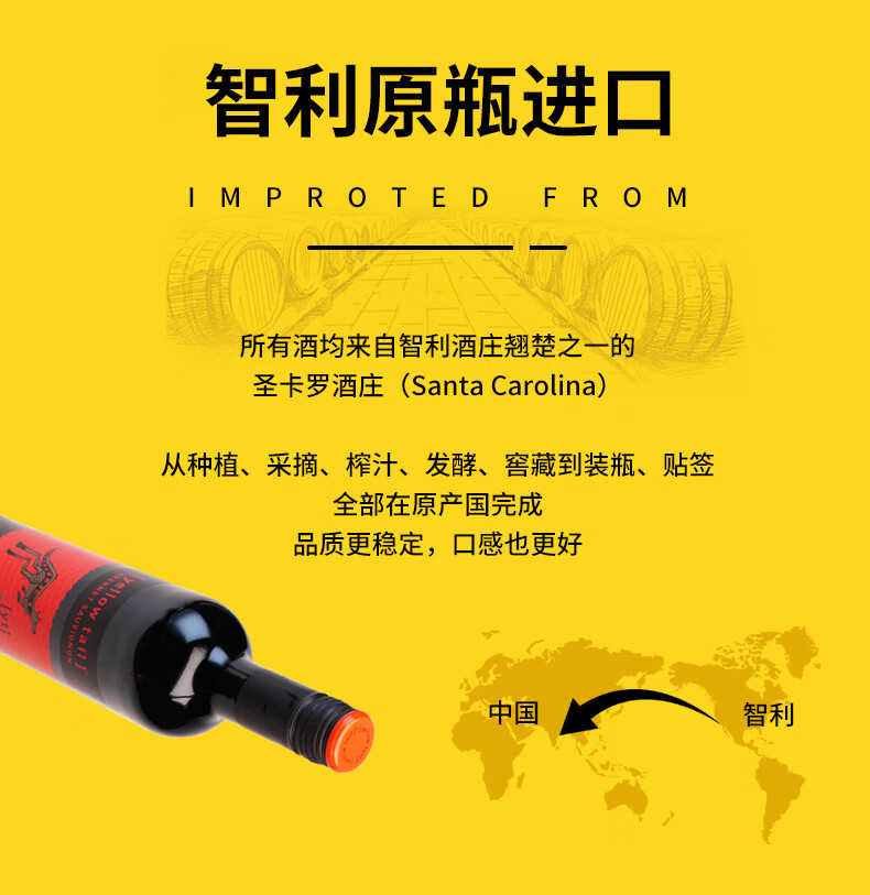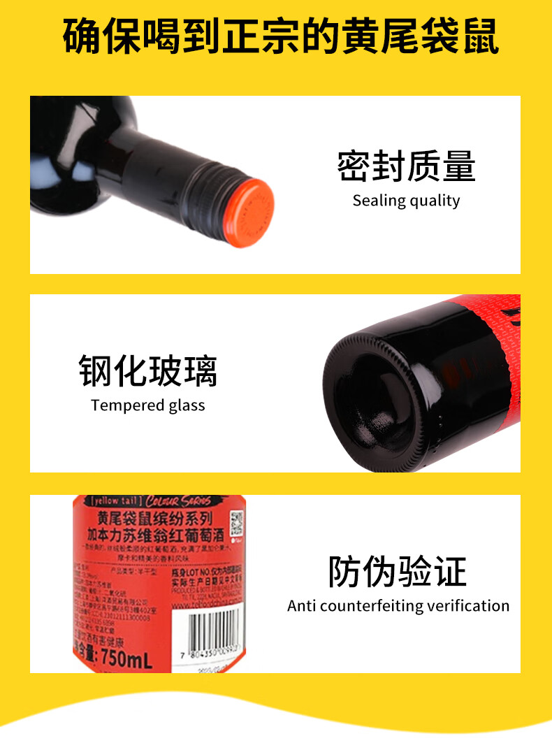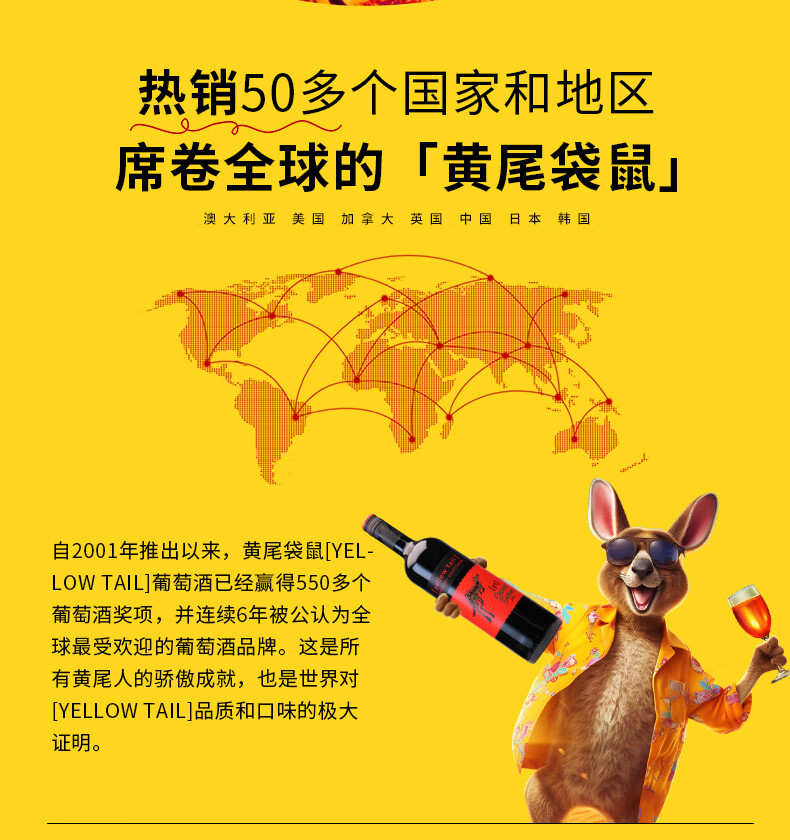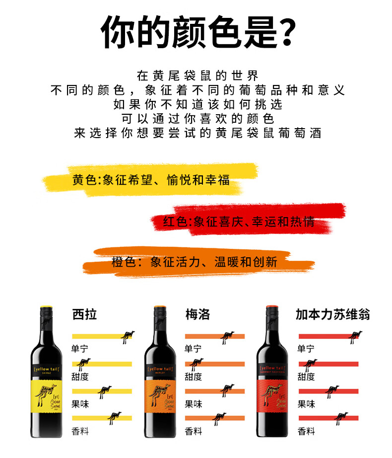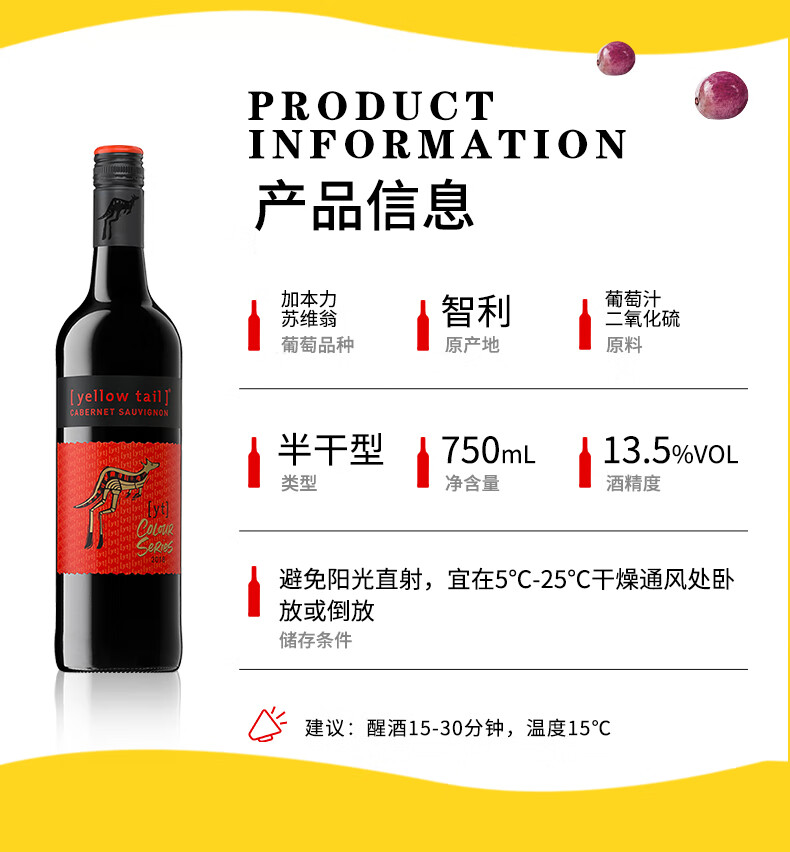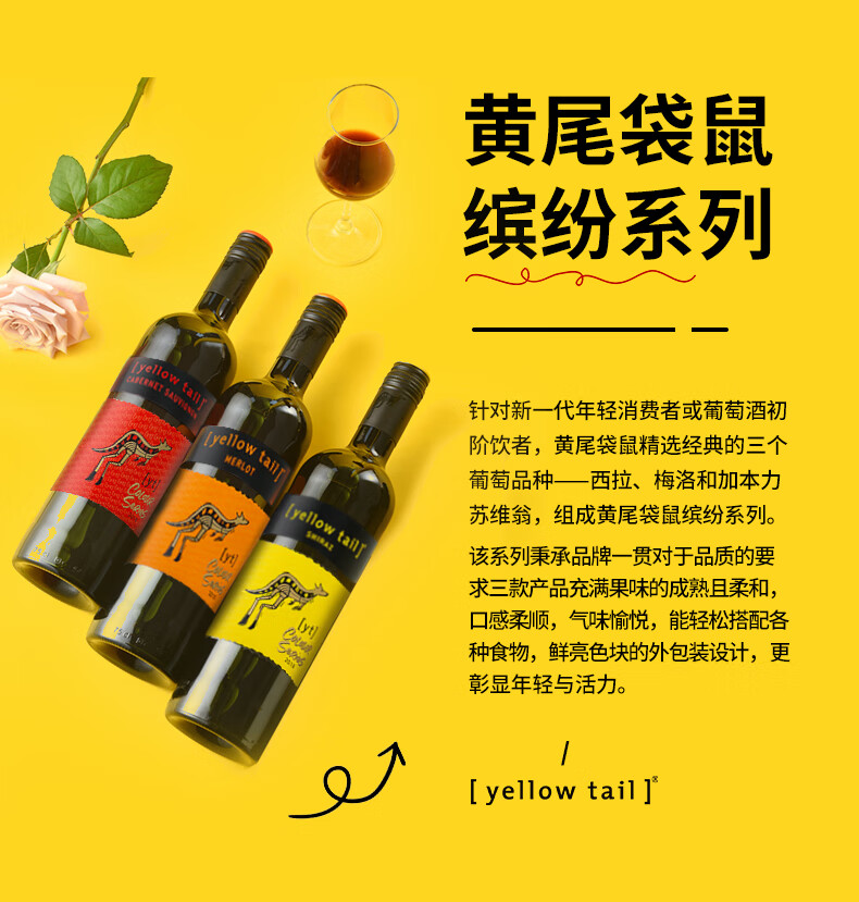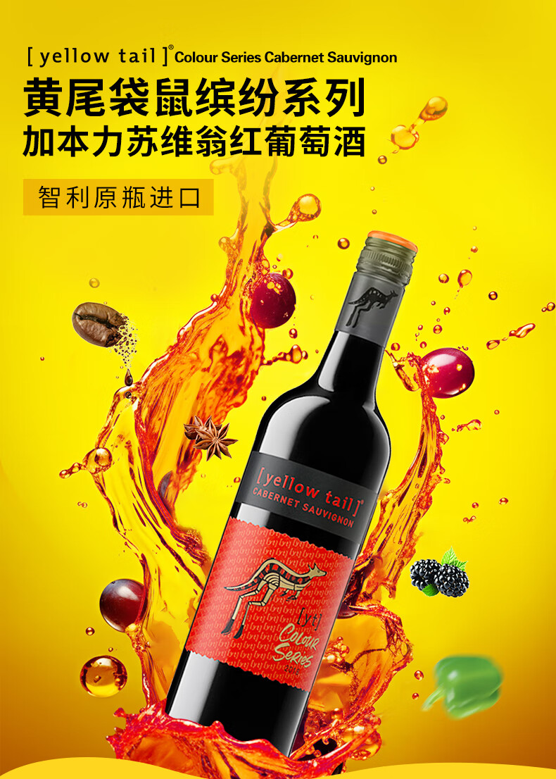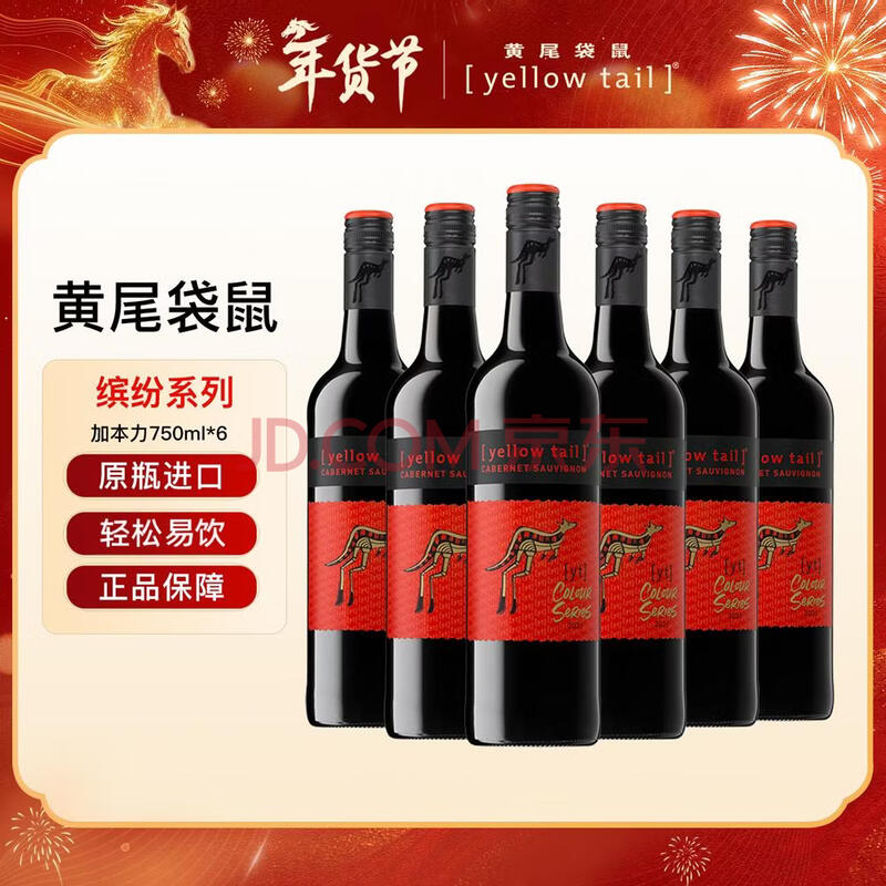黄尾袋鼠(Yellow Tail)年货节 缤纷系列 加本力赤霞珠葡萄酒 750ml*6瓶 智利原瓶进口