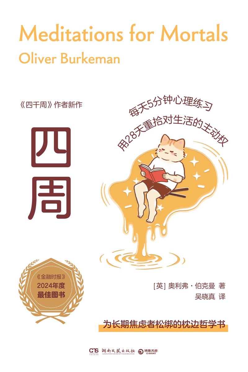 《四周》是一本带你走向自我解放之旅的心理自助类图书。它是获奖作者奥利弗·伯克曼继《四千周》之后的最新力作,旨在帮助读者摆脱自我剥削与精神内耗,在“倦怠社会”重拾对生活的主动权。这段旅程从放弃对完美主义的执念开始,从拥抱自身局限性、拥抱真实开始。它将《四千周》的核心主题——我们如何从有限的时间、分心的诱惑、效率至上的陷阱等等带来的内耗中解放出来——揉碎到二十八天之中,让你每天都有一个回归自我、获知新鲜洞察的安宁与喜悦时刻。