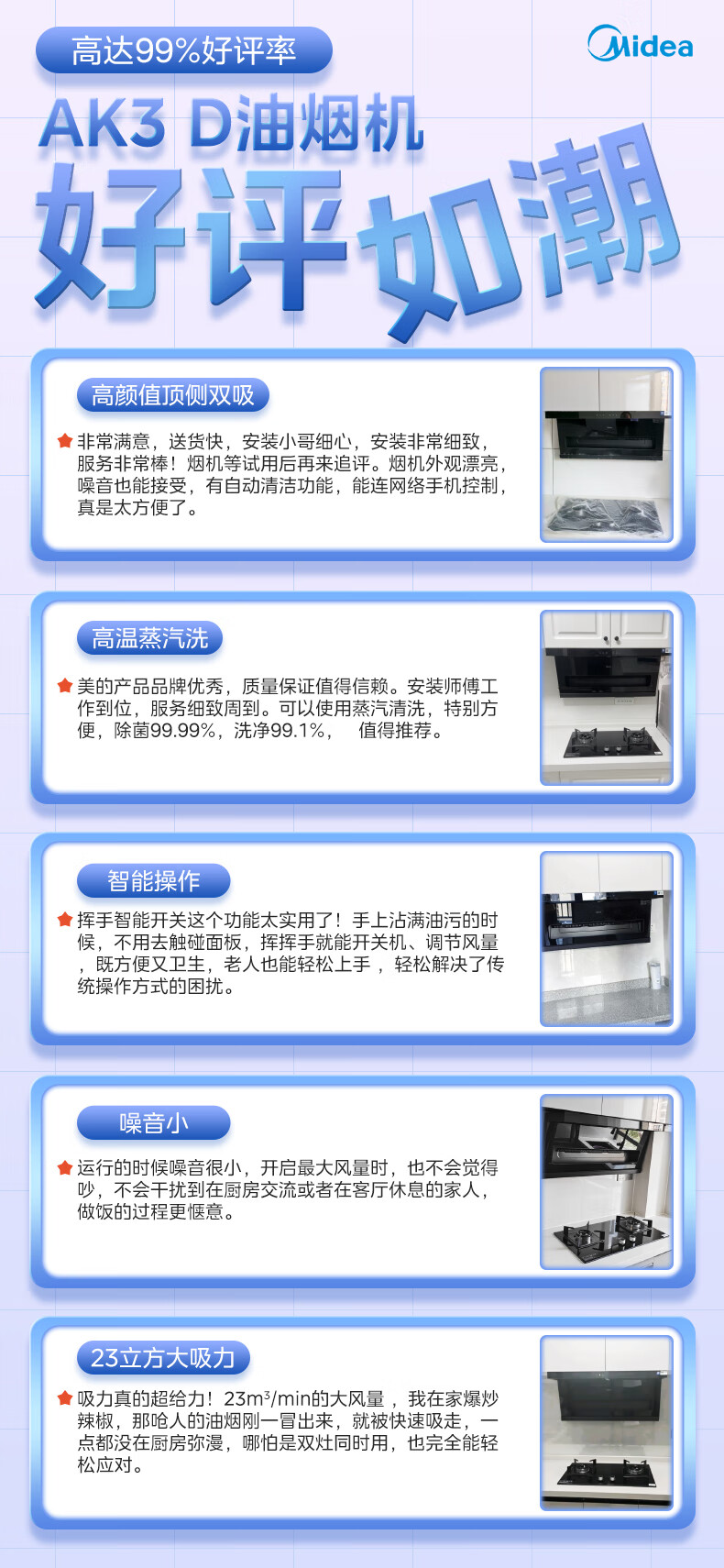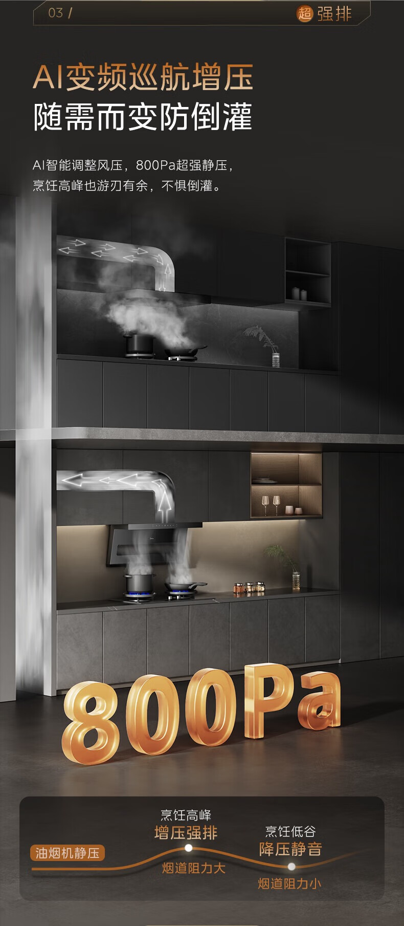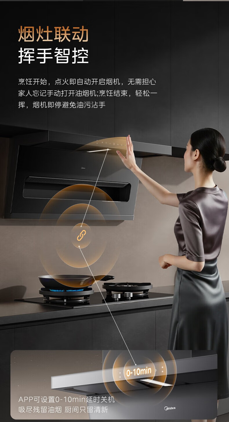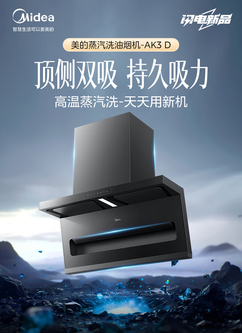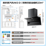 美的(Midea)顶侧双吸抽油烟机家用23m³变频大吸力蒸汽洗齐平橱柜800Pa静压烟灶联动吸油烟机 AK3 D