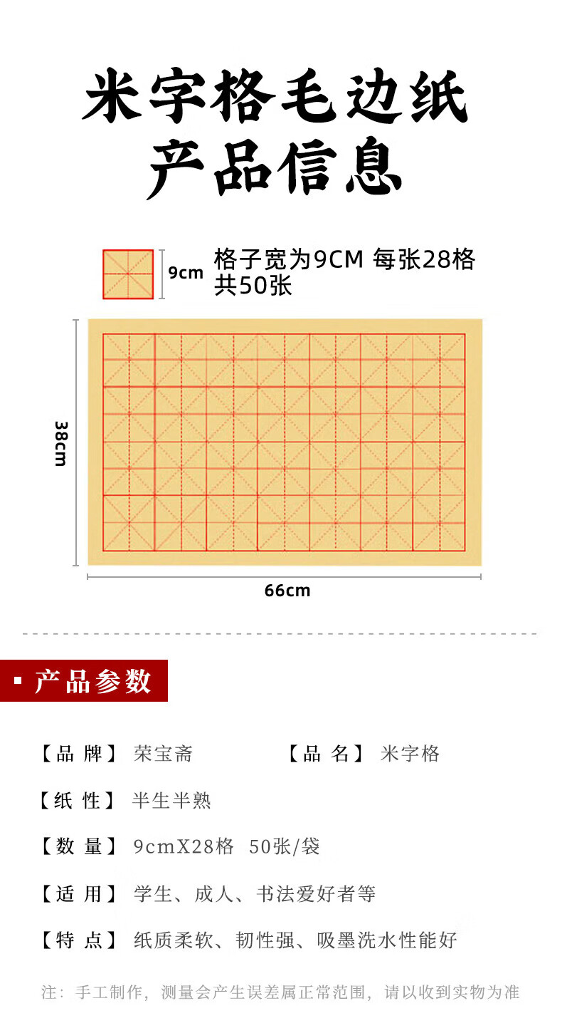 荣宝斋 米字格宣纸毛边纸 日星宣纸半生熟仿古书法专用练习作品纸 初学者毛笔字帖临摹 9cm*28格*50张
