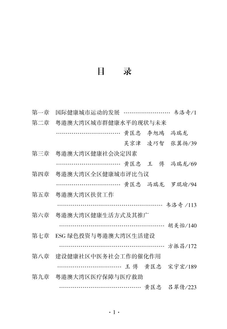 “健康城市”定义广泛、评估困难,但因在国际上推行多年,也有了共同认可的社会指标。《粤港澳大湾区健康城市的创建——社会指标的比较与论证》共收录11篇论文,包括《国际健康城市运动的发展》《粤港澳大湾区城市群健康水平的现状与未来》《粤港澳大湾区健康社会决定因素》《粤港澳大湾区全区健康城市评比刍议》《粤港澳大湾区健康生活方式及挑战》《ESG绿色投资与粤港澳大湾区生活建设》《建设健康社区中医务社会工作的催化作用》《粤港澳大湾区青少年身体发育与体质健康》等,依循公共卫生领域的思路,检视粤港澳大湾区健康城市的现状、不足和未来发展。这些论文可以分为三个部分,第一部分为国际及中国的粤港澳大湾区的健康城市运动,第二部分讨论健康城市相关的主要社会条件,第三部分罗列一些粤港澳大湾区健康城市实践的案例。
