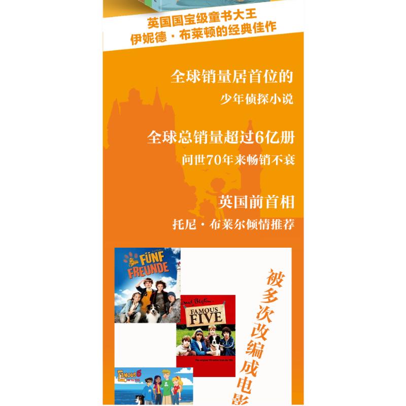 2.2008年,作者击败J.K.罗琳、简·奥斯汀、莎士比亚,被评选为“英国人很爱的作家”,她的传奇一生还被BBC拍成电影。3.在英国,平均每两分钟就有一套《疯狂少年侦探团》被卖出,整整影响了三代欧美孩子。